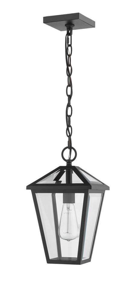 Illuminate an exterior front or back yard space with a classic fixture reflecting a charming village theme. Made from Midnight Black metal and clear beveled glass panels, this one-light outdoor chain mount ceiling light brings a design-forward look to wrap up a tasteful and functional patio or porch space with soft lighting.