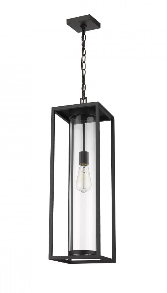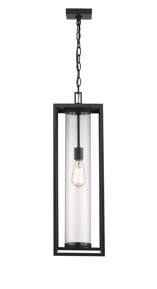 With a contemporary, understated vibe, this modern outdoor ceiling fixture from the Dunbroch collection makes a striking addition hung inside a porch entrance. With a long and open, box-like aluminum frame secured from a chain mount, it lends a sleek and subtle silhouette with its dark black finish. Accentuate a portico or roofed veranda with its single drop down light, protected by a clear cylindrical globe that casts a comforting glow.