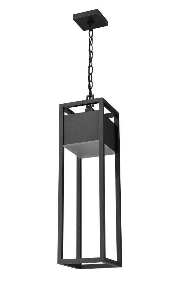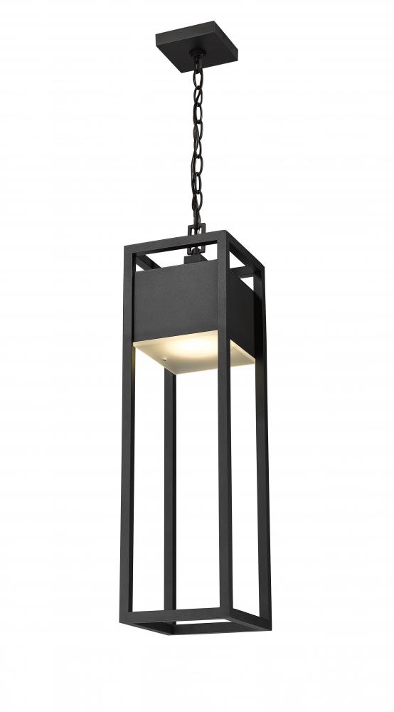 From the Barwick collection comes this contemporary outdoor ceiling fixture, perfect for mounting above a porch entryway. With an open rectangular aluminum cage in a deep black finish, this ceiling fixture hangs by a chain mount and can complement existing building facade colors. With an elegant touch, this outdoor ceiling fixture also comes with an energy-efficient LED-integrated lamp tucked beneath an etched glass plate.