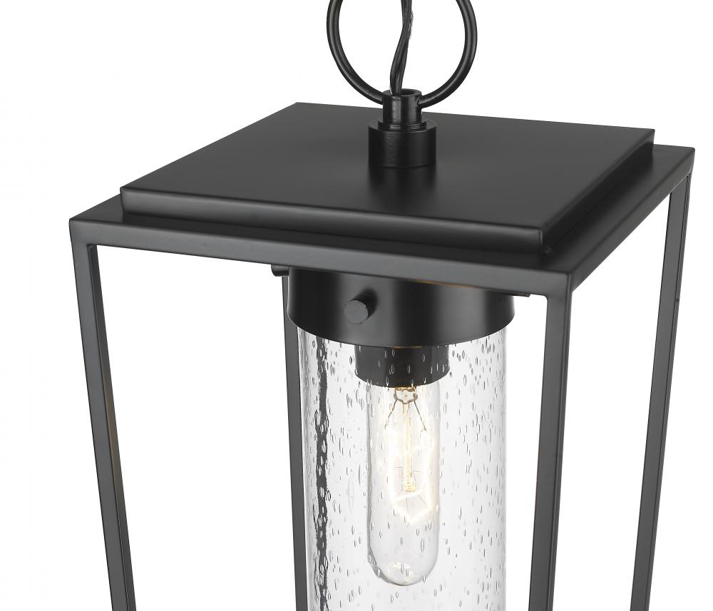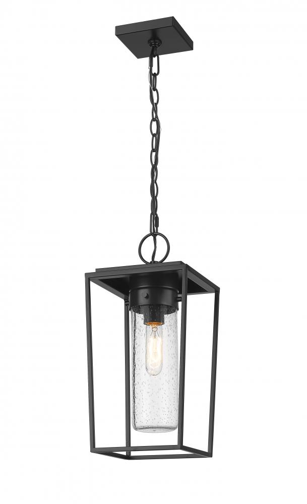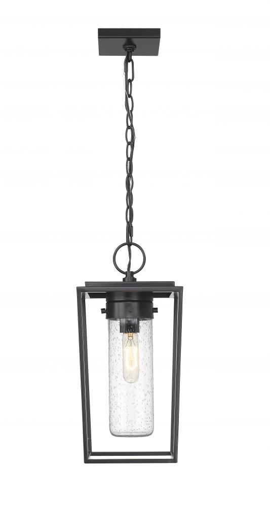 Bring a sleek village look with modern updating to an exterior space with the Sheridan one-light outdoor chain mount ceiling fixture. Linear profiling builds a box-style tapered frame fashioned of black aluminum & steel, with a seedy glass cylinder shade seeking shelter inside. All elements are designed to accommodate typical outdoor weather conditions.
