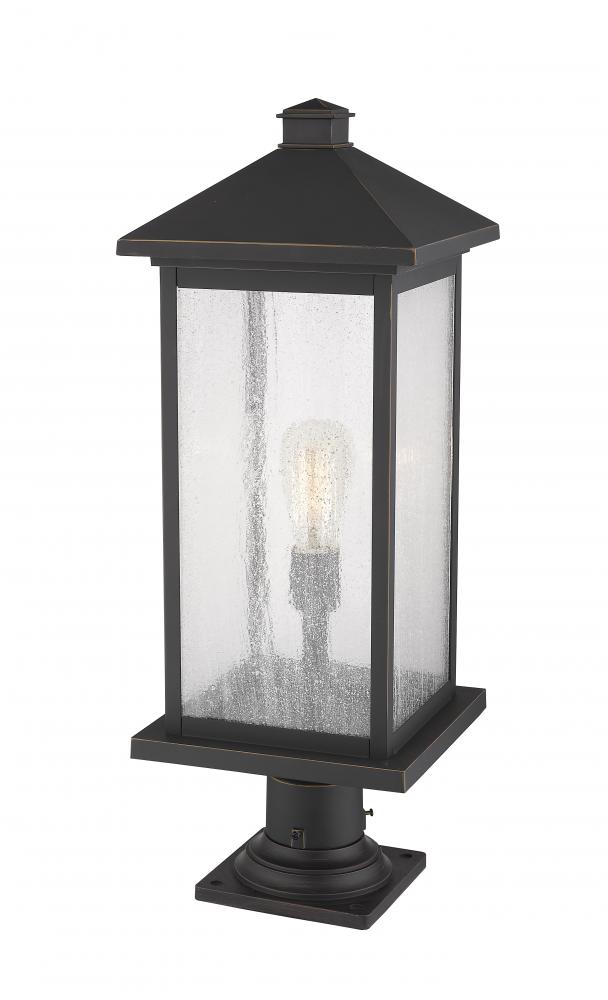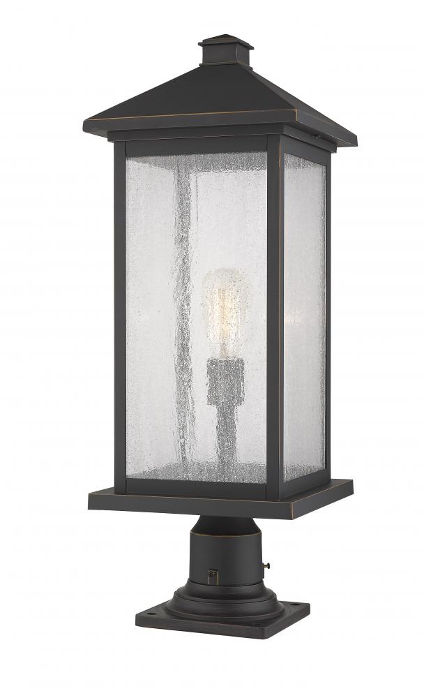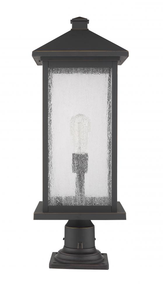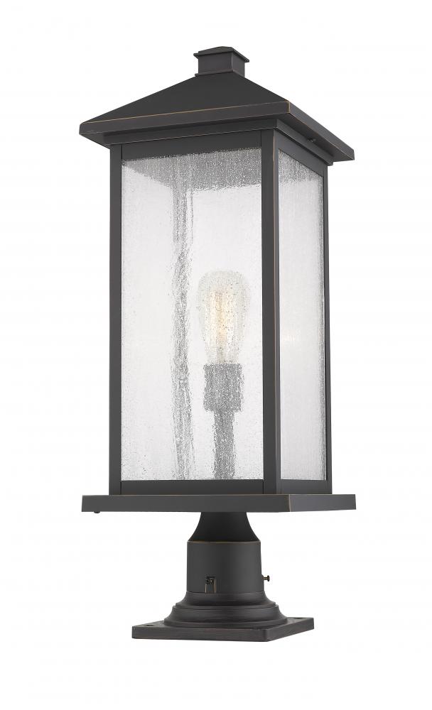 Top off a fence or light post with this stylish outdoor one-light lantern, full of elongated and sleek details. Sophisticated rubbed bronze streamlines the angles and frame while the clear seeded glass shade adds depth.