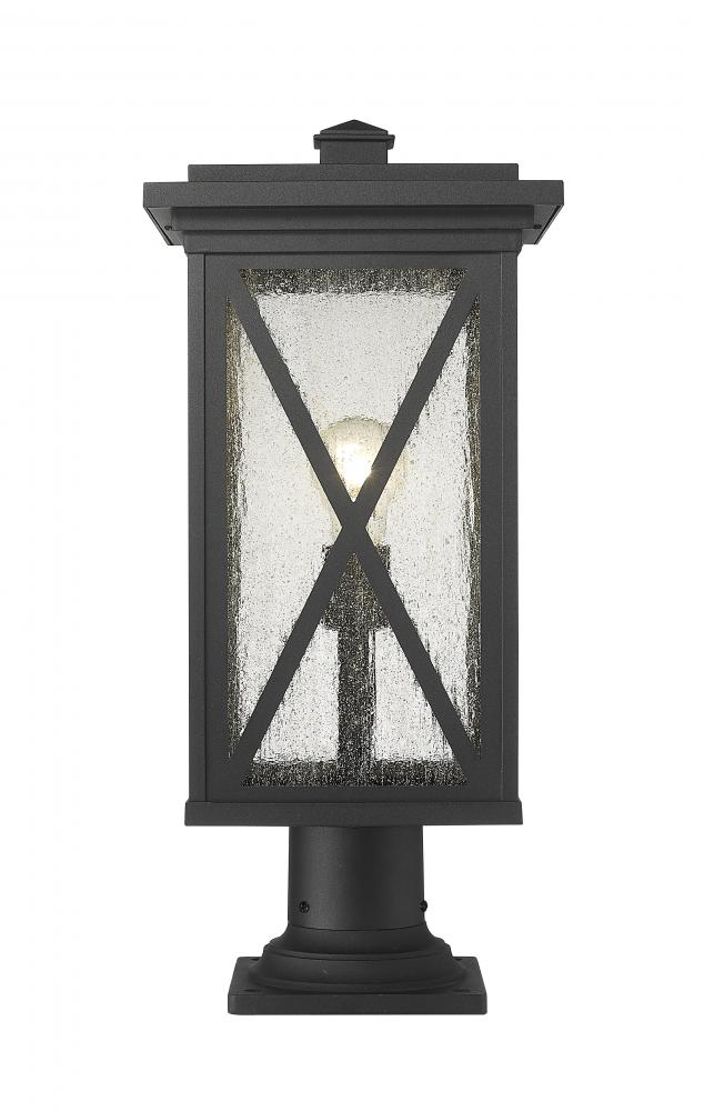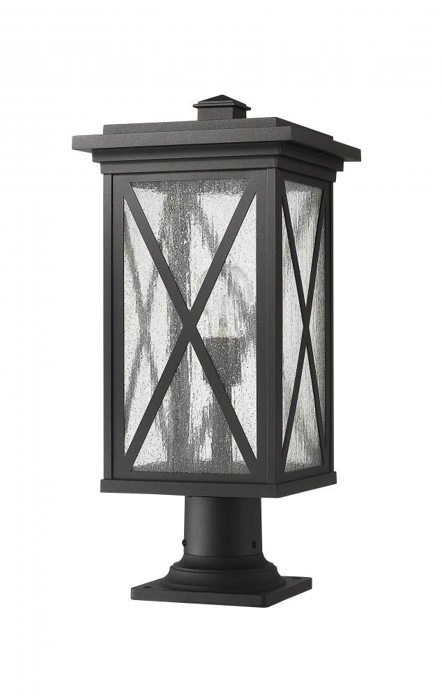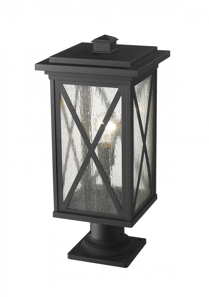 This one-light outdoor pier mounted fixture has a broad base, and comes in a box-shaped black aluminum cage with a clear seedy glass finish. It softly diffuses light to provide a welcoming glow to your front entrance or patio. Compelling X-accents bring dimension and character.