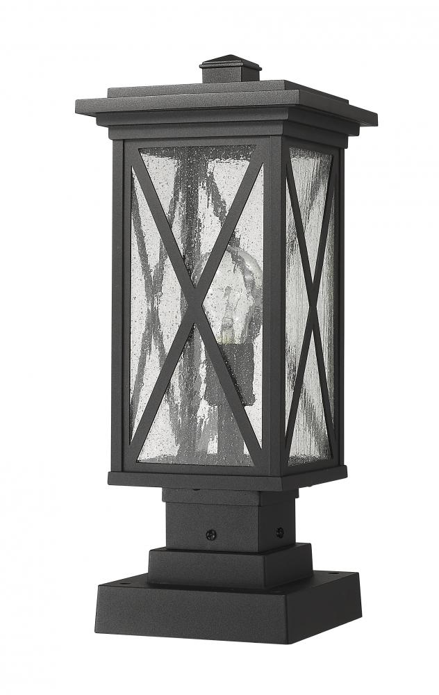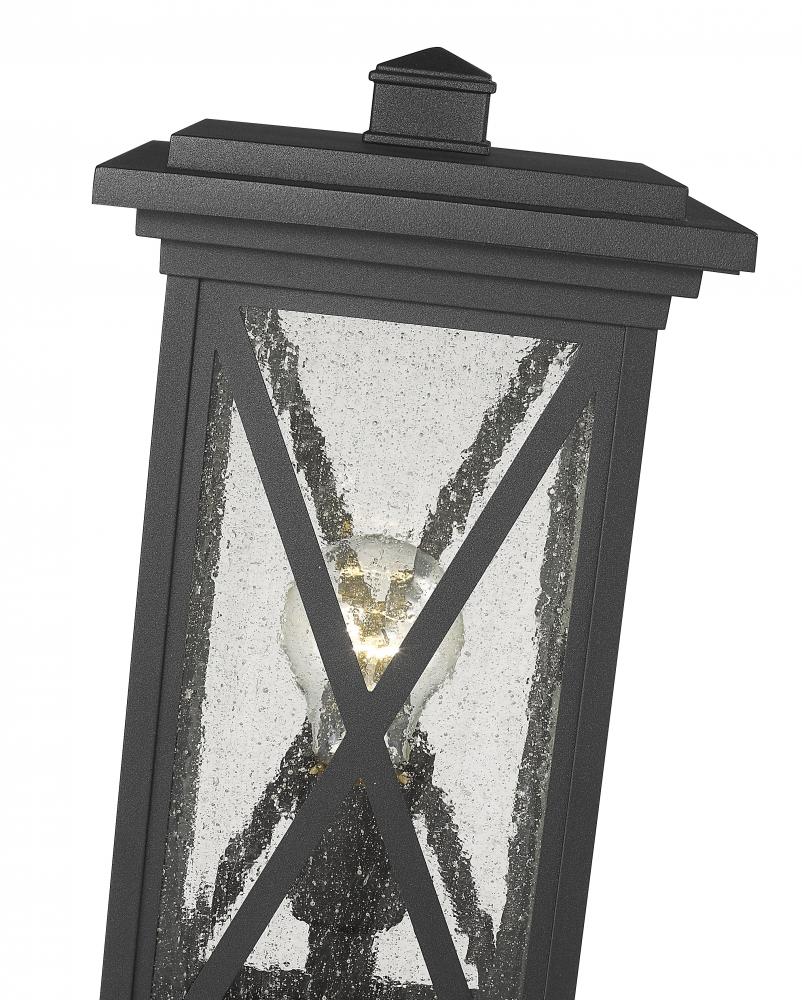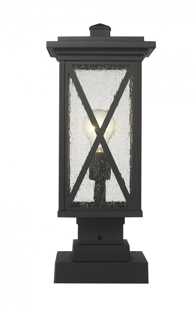 This one-light outdoor pier mounted fixture has a broad, square-shaped, tiered base, and comes in a box-shaped black aluminum cage with a clear seedy glass finish. Compelling X-accents bring dimension and character. It softly diffuses light to provide a welcoming glow to your front entrance or patio.