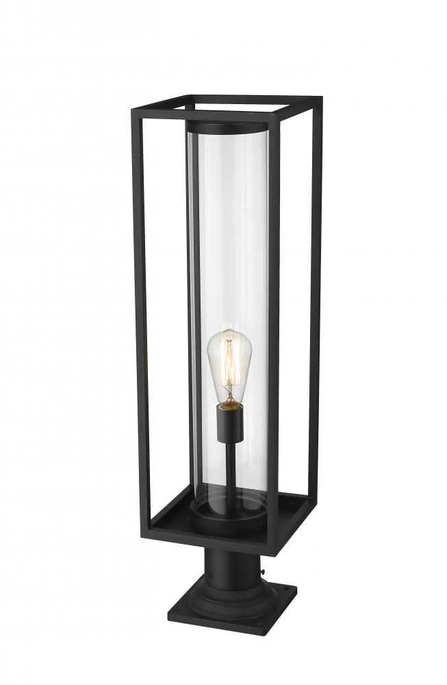 Illuminate your outdoor entertainment space with this modern outdoor pier mounted fixture from the Dunbroch collection. Featuring a rectangular lantern with an airy, open silhouette, this outdoor patio fixture is perfect for casting light on decks and verandas. With a dark black aluminum frame and a single light surrounded within a clear glass cylindrical globe, this pier mounted fixture lends a sophisticated, yet understated contemporary vibe.