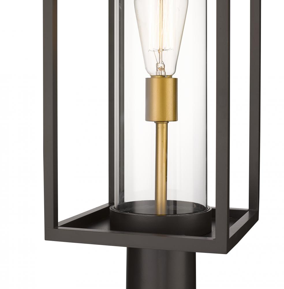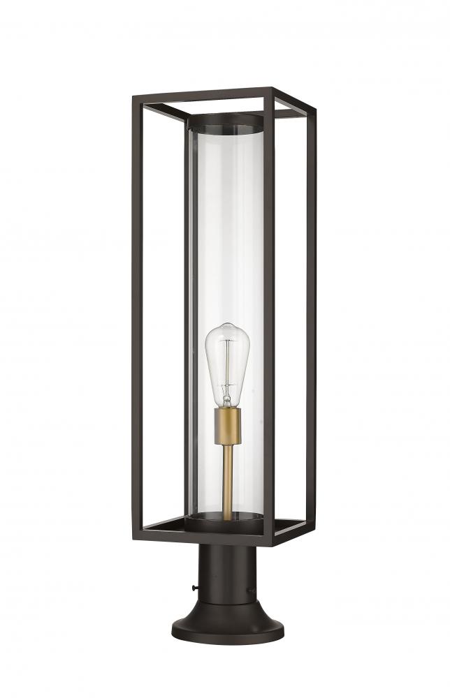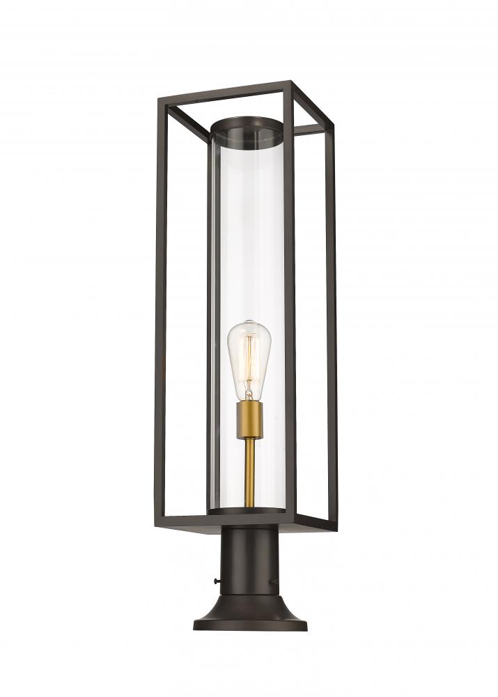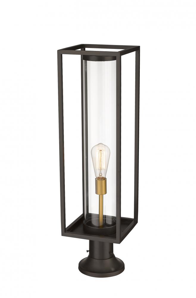 Illuminate a spacious veranda entertainment area with this modern outdoor pier mounted fixture from the Dunbroch collection. Featuring a rectangular lantern with an airy, open frame structure, this outdoor patio fixture can be mounted to walkway columns or landscape posts to provide plenty of exterior lighting during the evening hours. This outdoor light fixture also comes in a deep bronze aluminum finish with a single light mounted on warm brass stand, which is encased in a clear glass cylindrical globe, lending a contrasting, yet understated contemporary vibe.