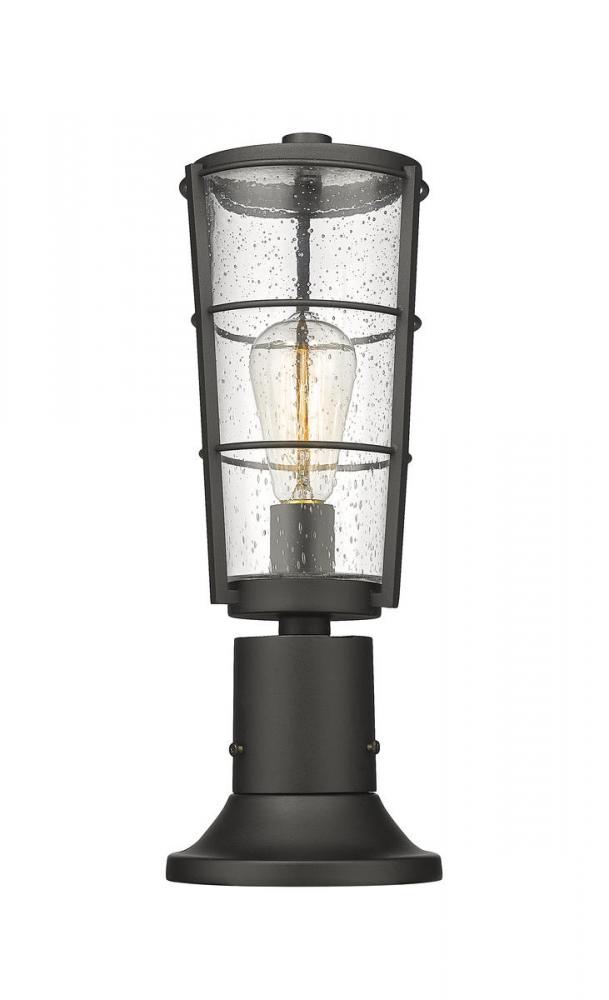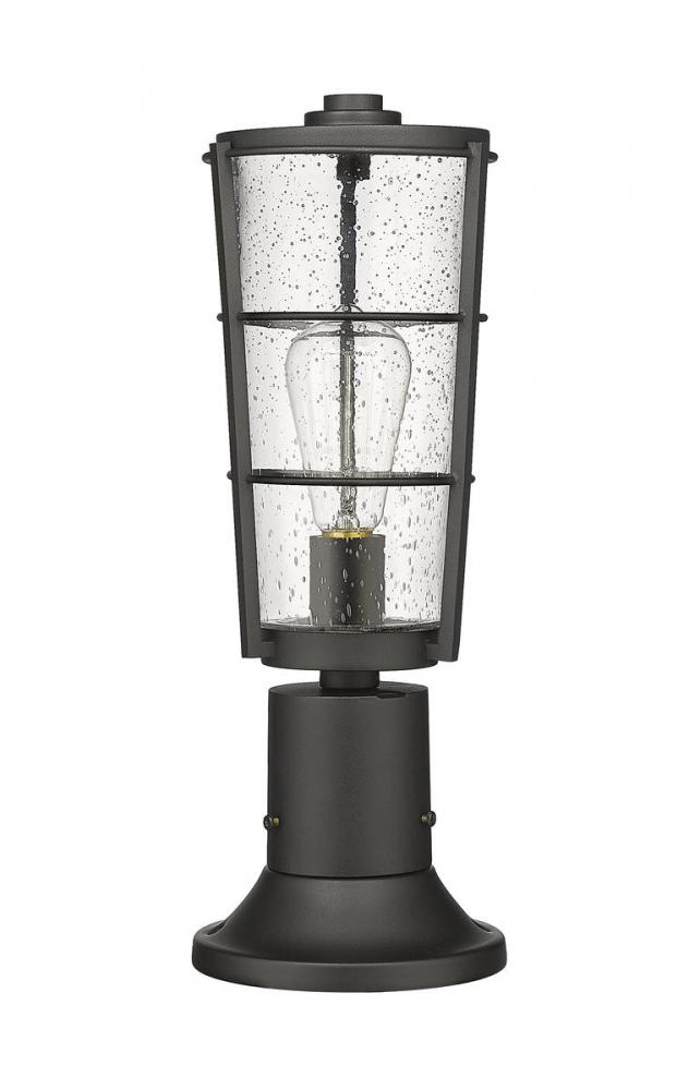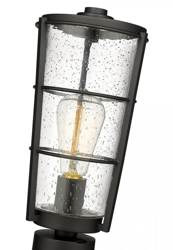 Old meets new in an inspiring design that blends village industrial with modern. This one-light outdoor pier-mounted fixture from the Helix collection adds charming elegance with a lantern-inspired silhouette crafted of hand-worked black finish aluminum and a romantic clear seedy glass shade.
