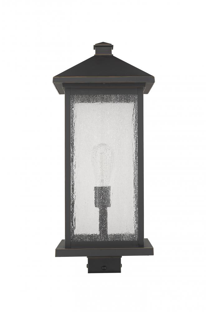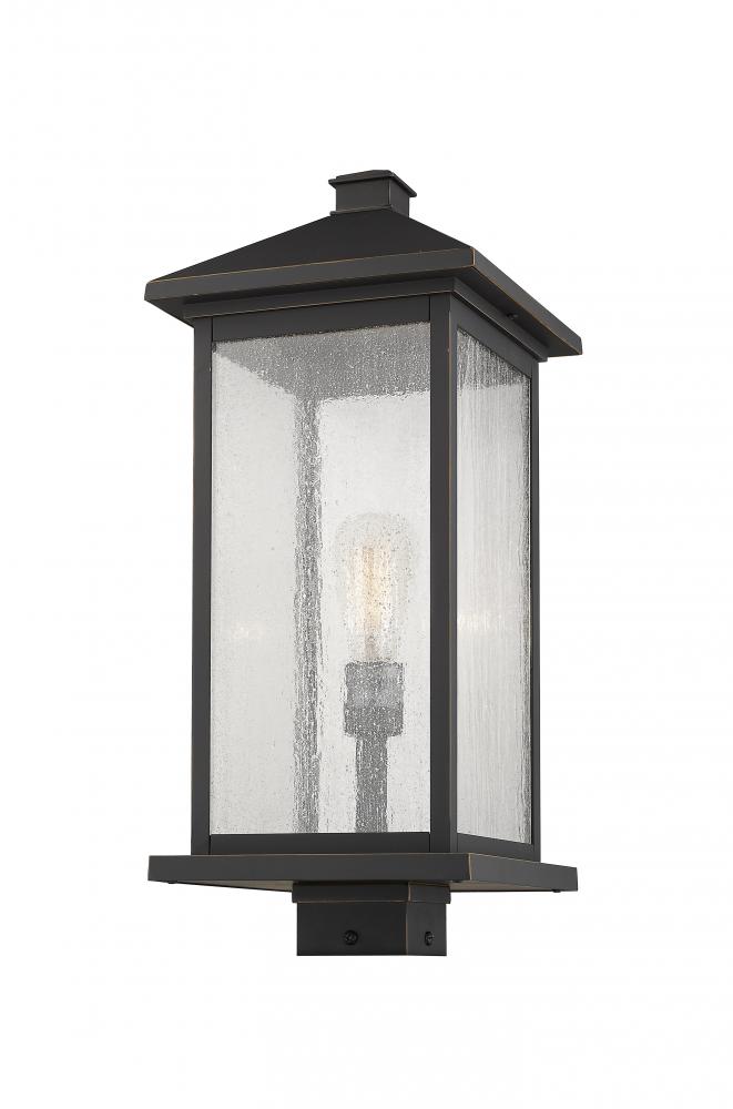 Rich details and sleek lines from this one-light post lantern offer a streamlined look to any outdoor space. Richly hued outdoor rubbed bronze combines with clear seeded glass to add dimension and radiance.