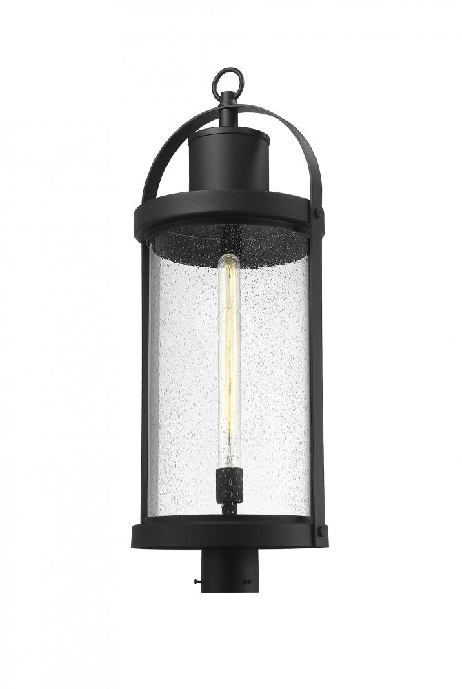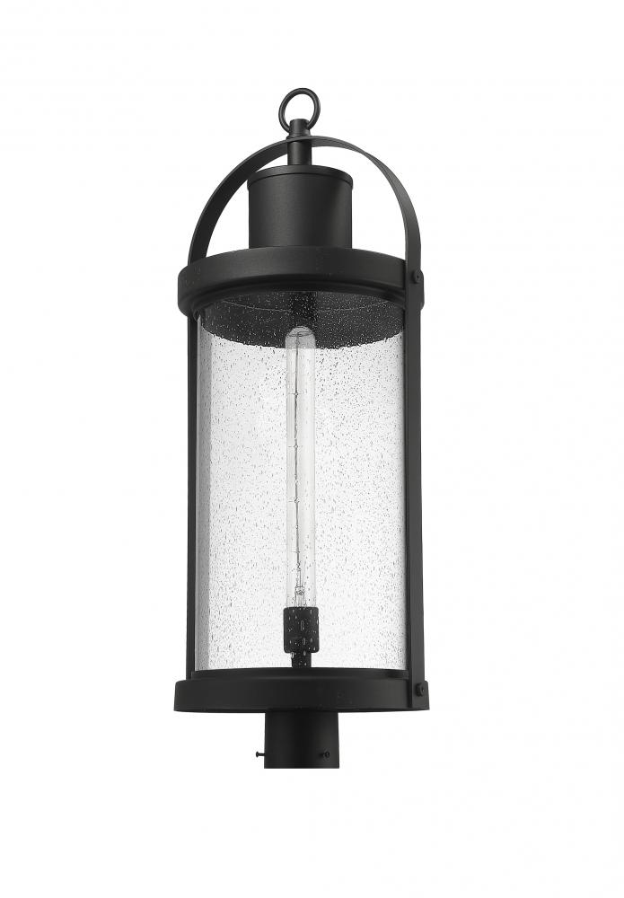 This one-light outdoor post mount fixture can revitalize the look of your porch, deck or patio space with its lantern-like appearance and strikingly modern silhouette. Black aluminum creates a bold accent, capping the top and bottom of a cylindrical shade thats finished with clear seedy glass. The LED bulb effectively illuminates your space, making this a clear choice for sleek, energy-efficient exterior lighting.