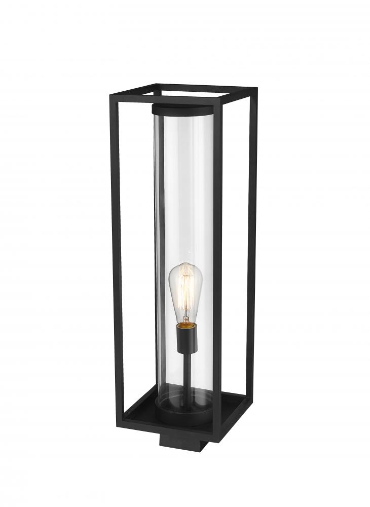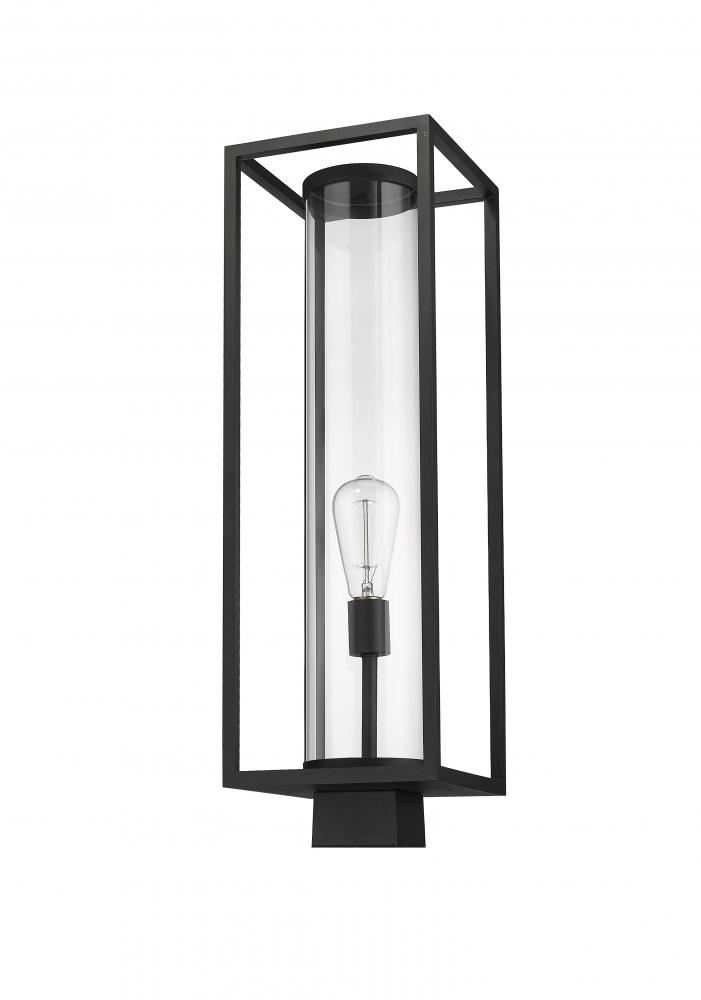 Shed a comforting glow on your exterior entertainment areas with this contemporary outdoor post mount from the Dunbroch collection. Mount this light fixture to deck railing or posts scattered around the landscape, lending a modern vibe to the home with its open, airy rectangular aluminum lantern. This outdoor light fixture also features a dark black frame finish that works with any facade colors and materials, along with a single light encased within a clear, tube-like glass globe.