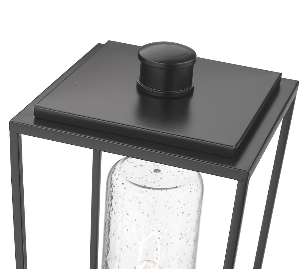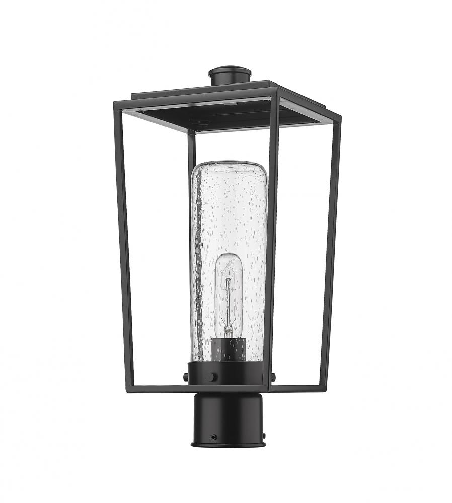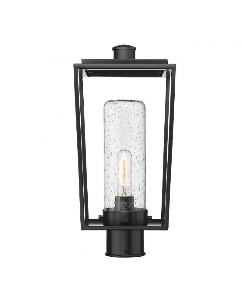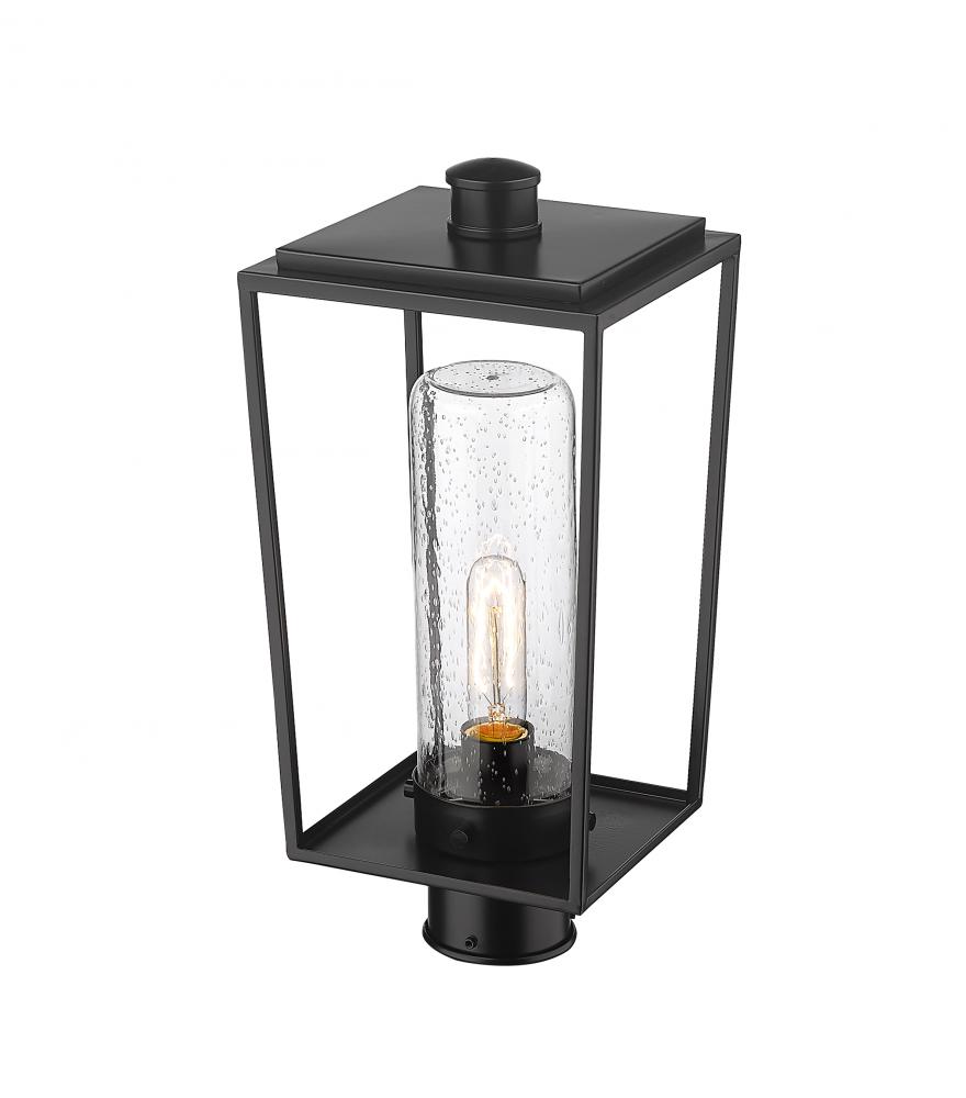A romantic seedy glass cylinder shade sits nestled in a lantern-style black finish aluminum & steel frame, forming a classic village look to the Sheridan one-light outdoor post mount fixture. Top an existing post with this elegant transitional fixture with an open, boxy design and ornate details.
