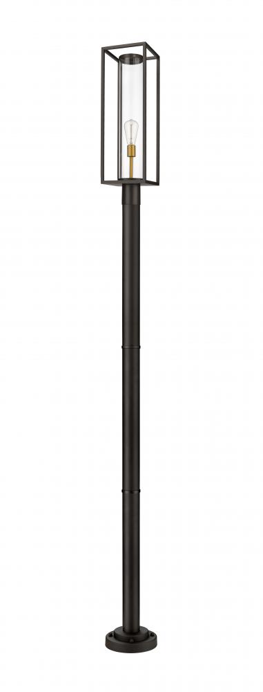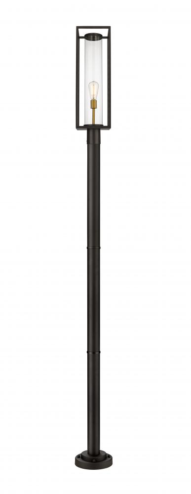 Illuminate a pathway or landscape with this modern outdoor post mounted fixture from the Dunbroch collection. Featuring a sleek, tall post and rectangular lantern with an exposed, open silhouette, this outdoor light fixture casts a soothing glow wherever you need. Its warm, deep bronze aluminum frame and single light encased behind a clear cylindrical globe lend touch of glamour to this classically styled post mounted fixture.