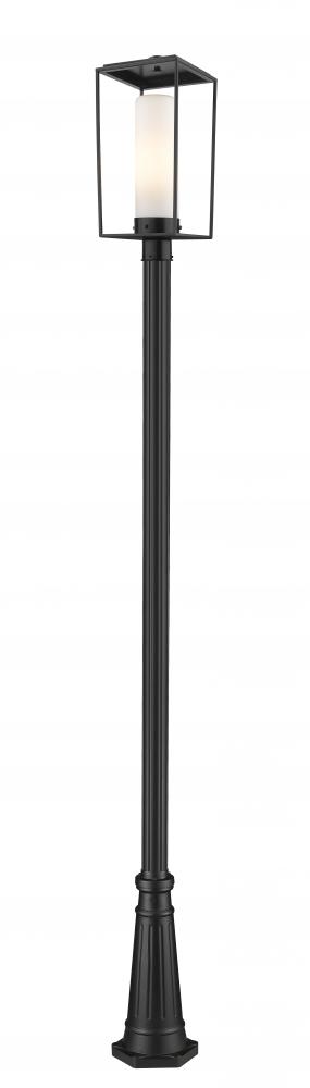 A fluid base design embellishes the overall aesthetic of the Sheridan one-light outdoor post mounted fixture, adding a romantic village motif and a balanced symmetry. Dress up a residential or commercial exterior space with this light crafted of black finish steel, enjoying its lantern-style frame and a chic white opal glass cylinder shade.
