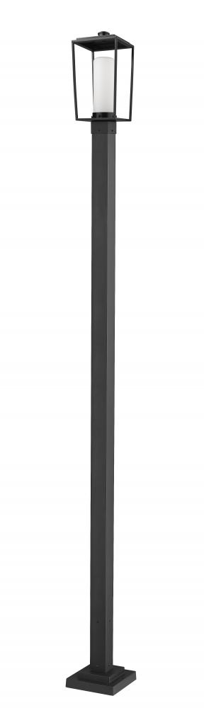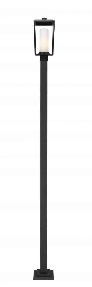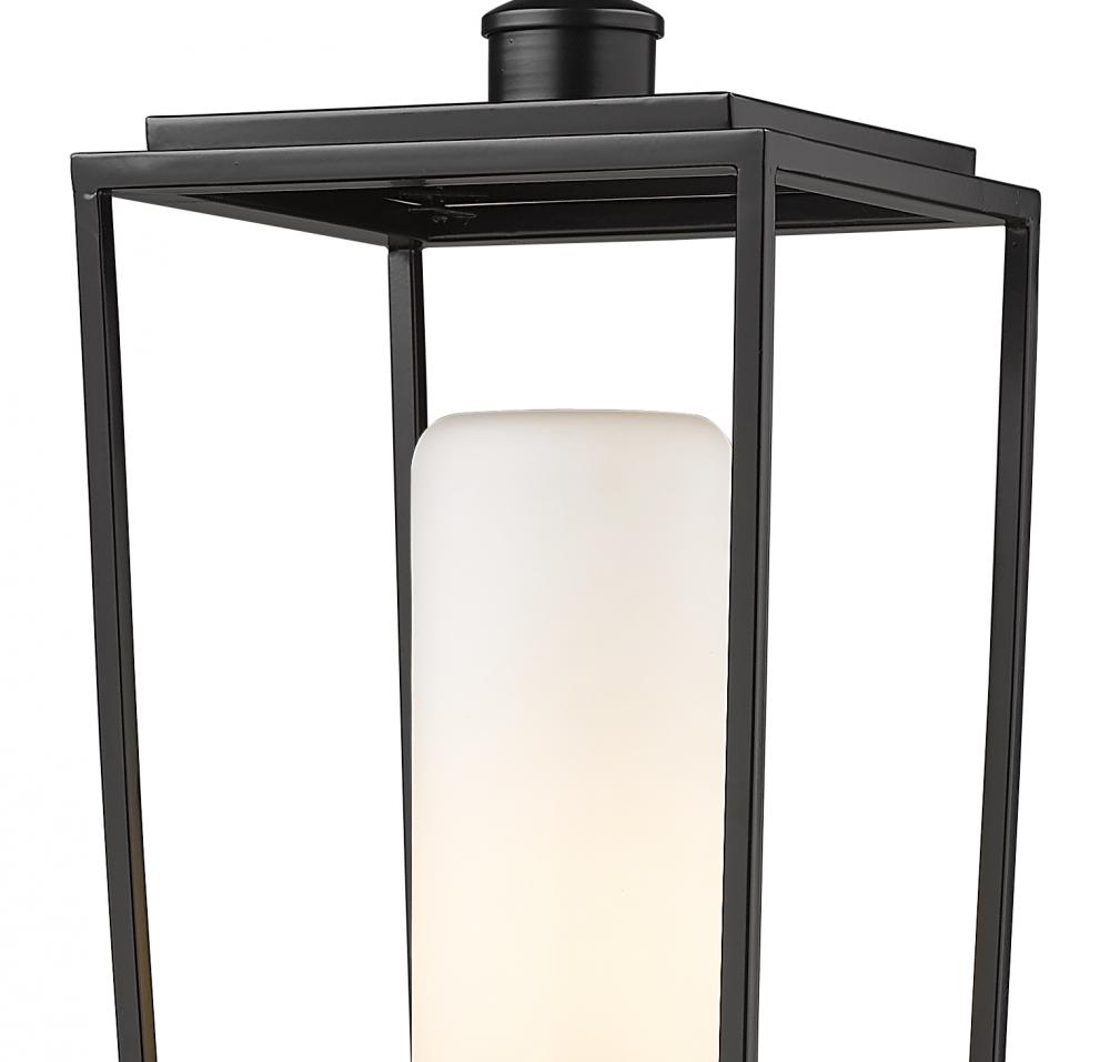 Perfect proportion adds to the classic aesthetic of the Sheridan one-light outdoor post mounted fixture, a tasteful source of lighting for exterior spaces. Crafted of black finish steel, its pole body and base join an open lantern-style frame with a hint of village personality. Ambient lighting glows through a white opal glass cylinder shade.