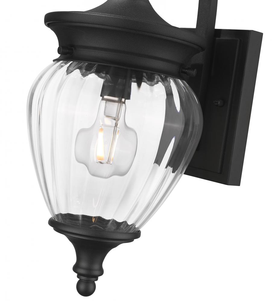 Attention to detail fashions a decadent look in this one-light outdoor wall light, designed for impact. A shapely clear ribbed glass shade nestles within Coastal black paint finish aluminum framing, bold and inspired, with a vintage character that enhances patios, porches and other exterior walls. Dimmable, this fixture is the perfect way to bring a dose of character to exterior decor.