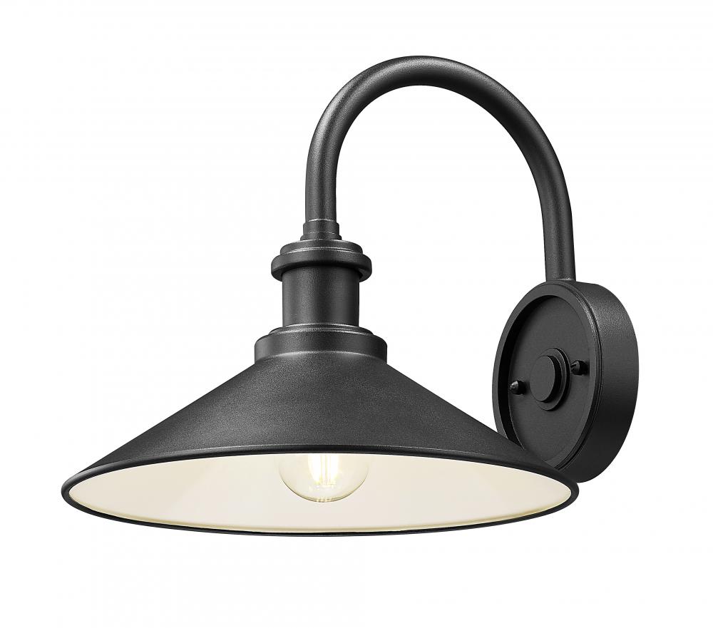 An arched arm and conical shade create compelling style for a modern industrial one-light outdoor wall sconce. In a textured sand black finish that stands up to the elements, its a favorite in home and commercial spaces, offering farmhouse charm and plenty of bright downlighting.