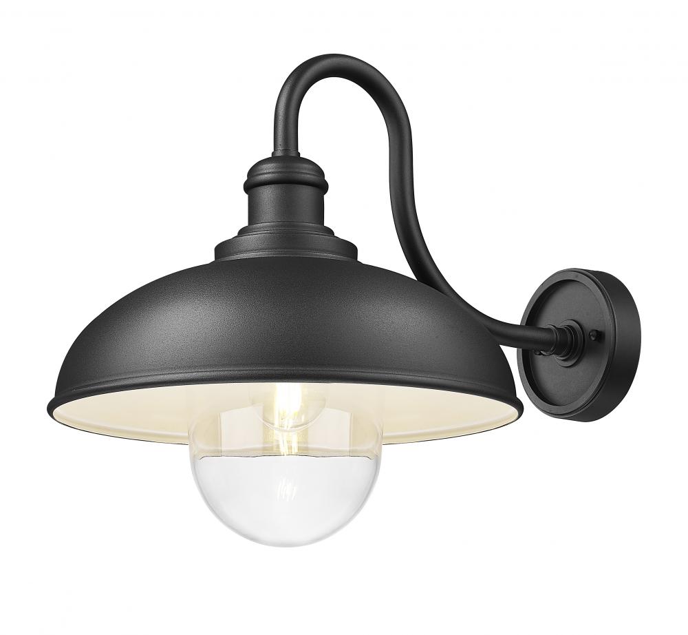 A capsule-style glass shade protects the light and offers charming flair to this modern industrial outdoor wall sconce. Designed with farmhouse character for inviting presence, it boasts a bold, decorative arm and domed shade, all in a textured sand black finish that adds durability you can count on.