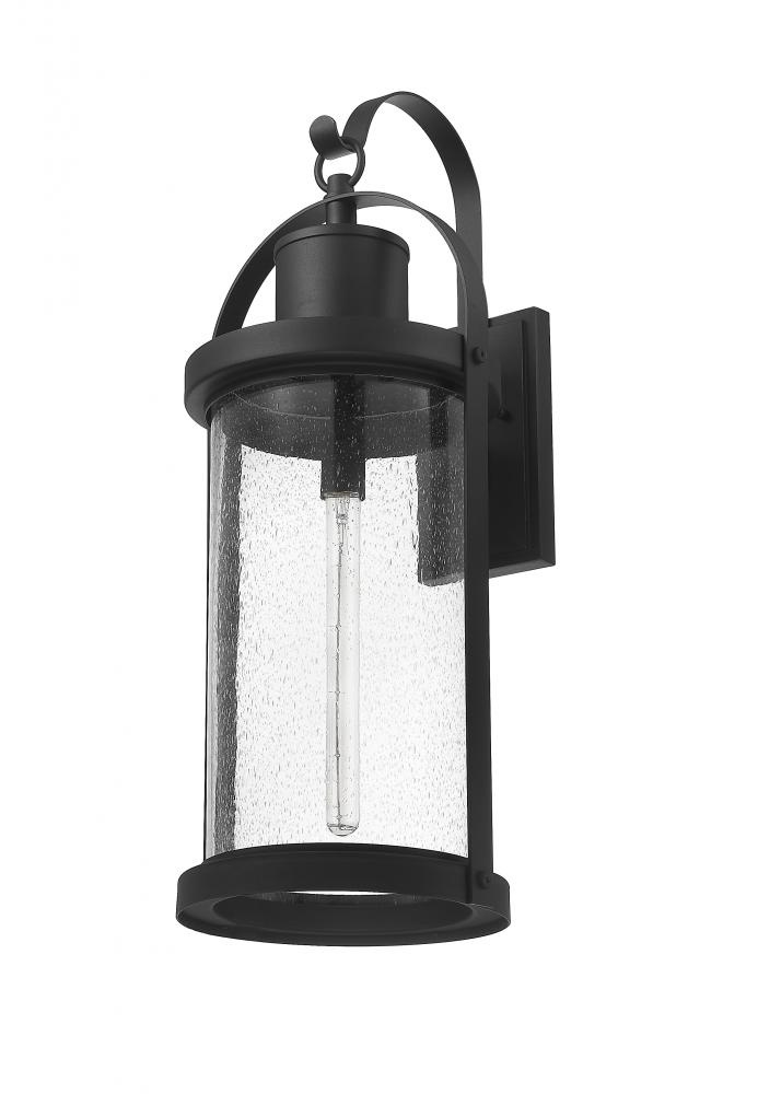 This one-light outdoor wall sconce can revitalize the look of your porch, deck or patio space with its lantern-like appearance and strikingly modern silhouette. Black aluminum creates a bold accent, capping the top and bottom of a cylindrical shade thats finished with clear seedy glass.