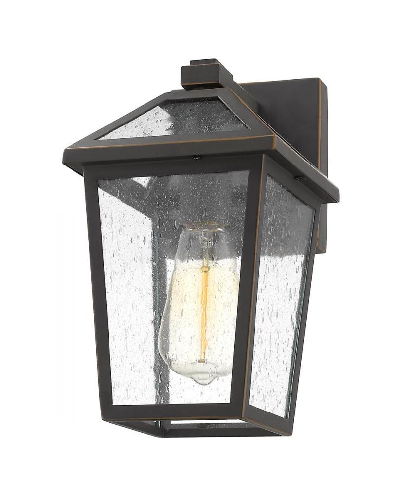Add ambient lighting to an exterior front or back yard space with a classic fixture reflecting a charming village theme. Made from Rubbed Bronze metal and seedy glass panels, this single-light outdoor wall sconce delivers a stylish upgrade to complete a design-forward look on a structure or fence.