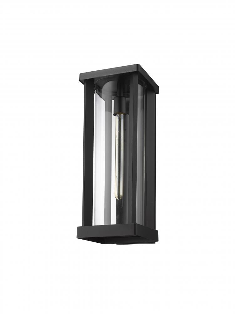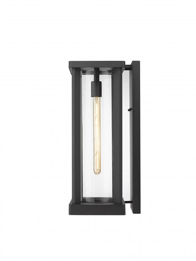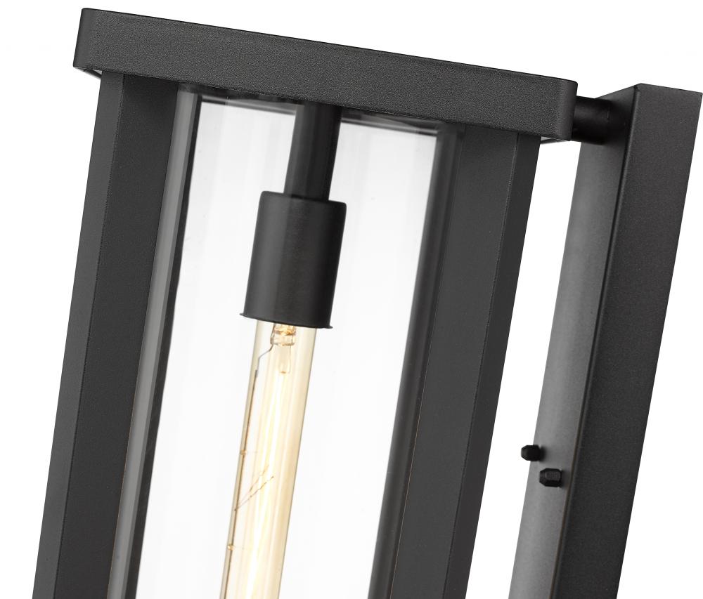 From the Glenwood collection comes this sophisticated, contemporary outdoor wall sconce, featuring a clear glass cylinder globe nestled inside a tall, rectangular aluminum frame. With a dark black finish that looks stylish and attractive against any exterior building materials, this wall sconce lends a striking, modern flair to any outdoor space. Flank a pair of these wall sconces beside a sliding glass door leading to a porch patio or veranda to provide adequate lighting and a relaxing glow.