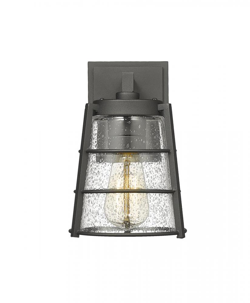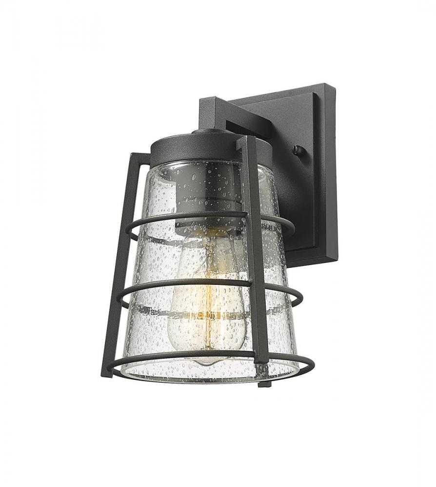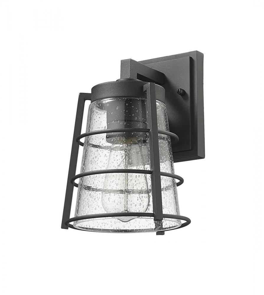 Add targeted lighting to a home or business structure with this outdoor wall sconce from the Helix collection. This one-light sconce offers a charming village-inspired theme with a lantern-like silhouette. A hand-worked aluminum frame with a matte black finish blends tastefully with clear seedy glass, yielding a sophisticated light that flatters in any area.