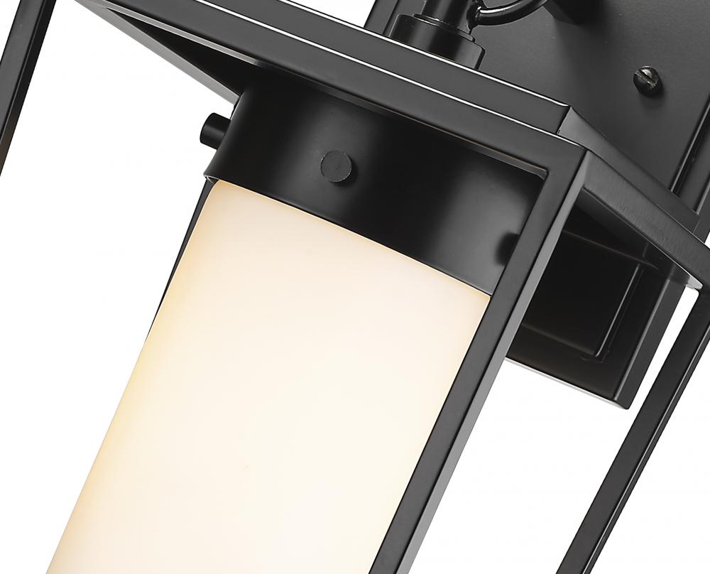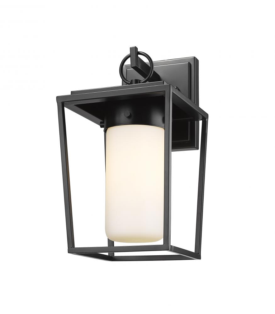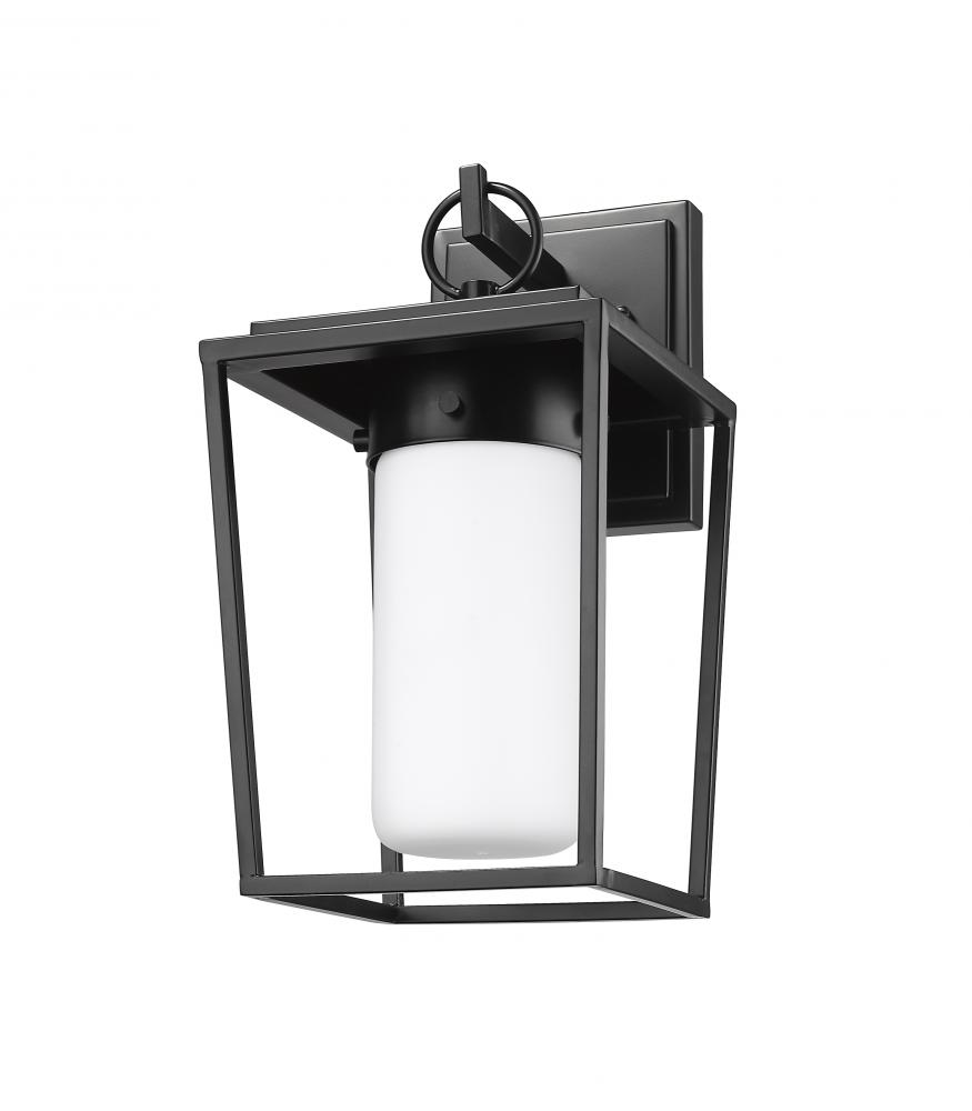 Bringing a mix of old and new design elements, the Sheridan one-light outdoor wall sconce creates a transitional theme as it provides ambient lighting on a residential or commercial structure. Village-inspired charm makes its way into an updated frame featuring an open box design, putting black finish steel construction to good use. Matching accents and a romantic white opal glass cylinder shade provide a contrasting palette and a tasteful source of outdoor lighting.