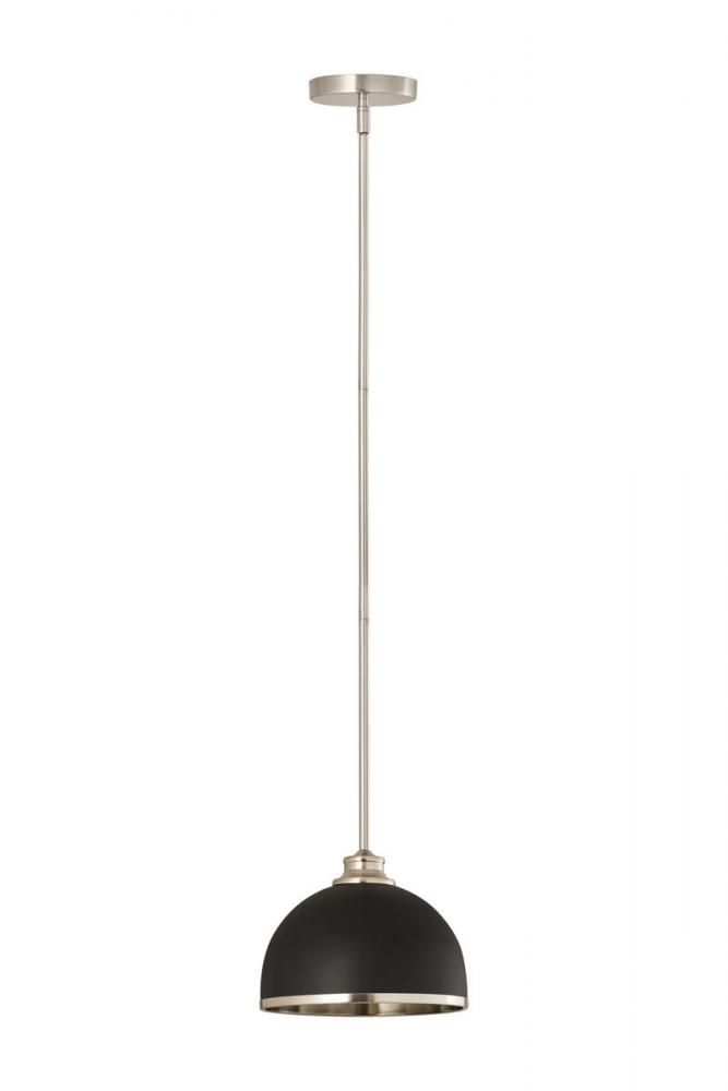 Easy elegance follows this domed metal one-light pendant with a crisp industrial influence and minimalist silhouette. A domed shade fashioned of matte black finish stainless steel is trimmed in brushed nickel finish metal with a brushed nickel finish down rod and canopy. This contemporary pendant is adaptable to a variety of d?cor schemes including farmhouse, modern industrial, and urban modern.