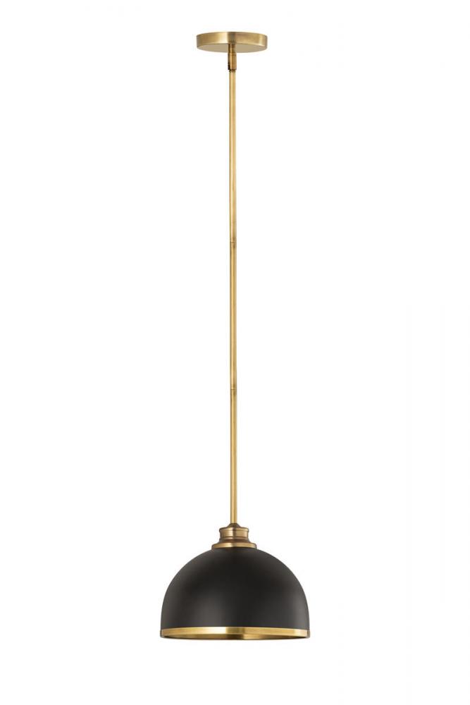 Easy elegance follows this domed metal one-light pendant with a crisp industrial influence and minimalist silhouette. A domed shade fashioned of matte black finish stainless steel is trimmed in warm rubbed brass finish metal with a rubbed brass finish down rod and canopy. This contemporary pendant is adaptable to a variety of d?cor schemes including farmhouse, modern industrial, and urban modern.