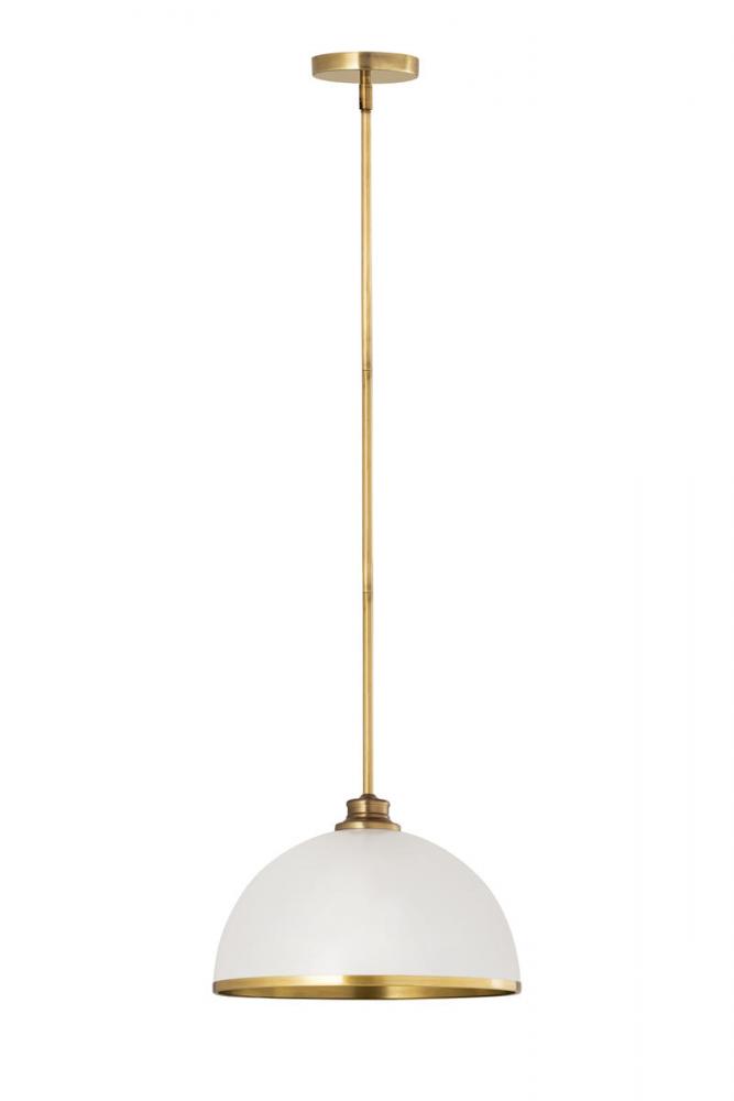 Chic, modern vibes add a stunning look to a custom kitchen, living space, or bedroom with this domed metal one-light pendant. A domed shade crafted of matte white finish stainless steel is trimmed in rubbed brass finish metal with a rubbed brass finish down rod and canopy. This updated pendant is suitable for a variety of d?cor schemes including farmhouse, modern industrial, and urban modern.
