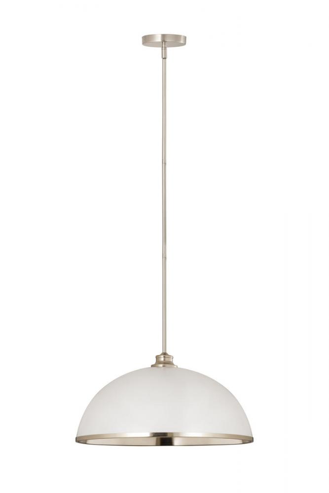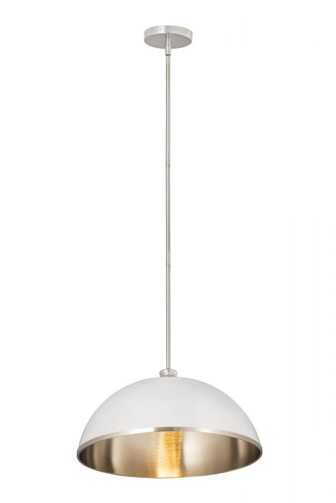 Sleek style takes on a modern look in this domed one-light pendant, a perfectly versatile way to illuminate a contemporary dining room, kitchen, or main living area. This pendant reflects myriad motifs including farmhouse, urban, and industrial, and brings simplicity with tasteful aesthetics. Crafted of matte white finish stainless steel, its accenting brushed nickel edge trim, down rod, and canopy deliver a decadent look.