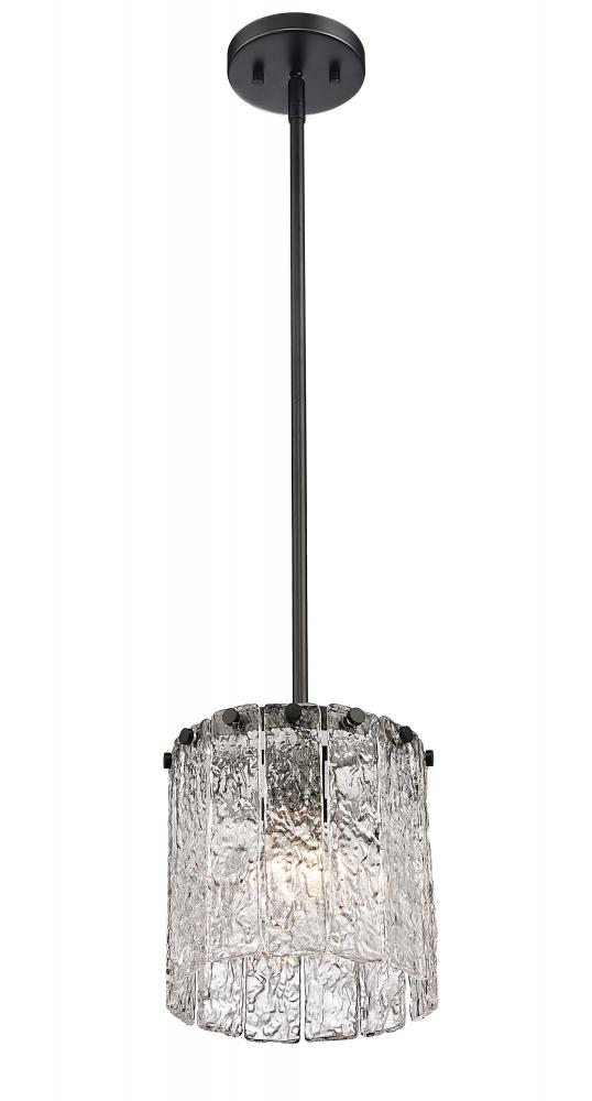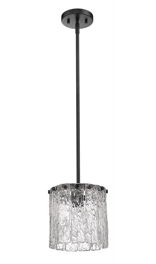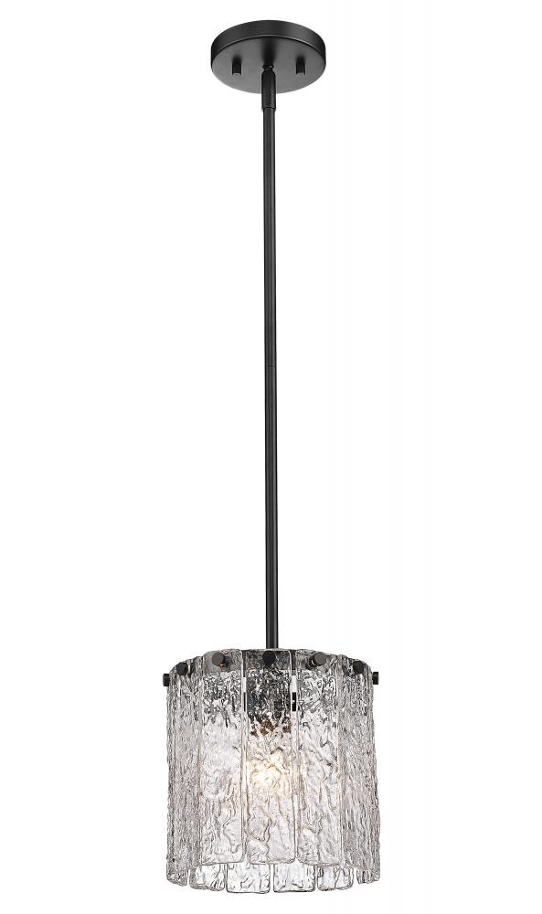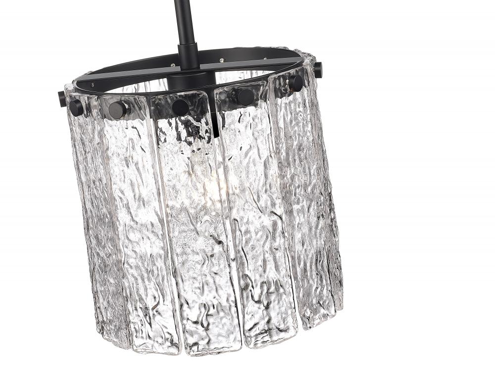 Find chic artistry in minimalism with the decadent design of a fixture with a chic style footprint. The Glacier one-light pendant offers a decadent look of individual clear textured glass panels that emulate melting ice, an extraordinary effect with dramatic impact in a foyer, dining space, or nook. Matte black steel is placed as a crown frame, adding a contrast in both style and finish and embellishing the optical delight accomplished when the fixture is illuminated.