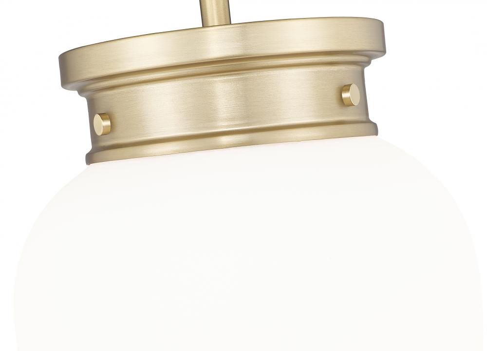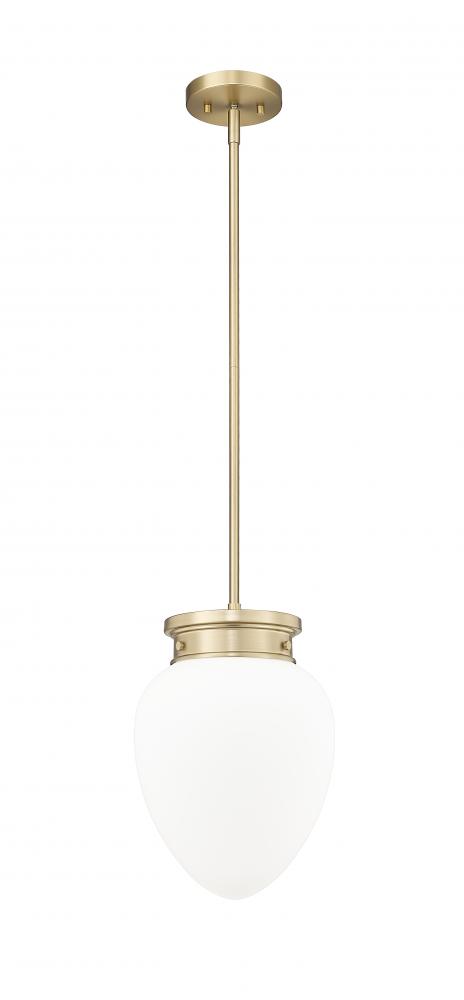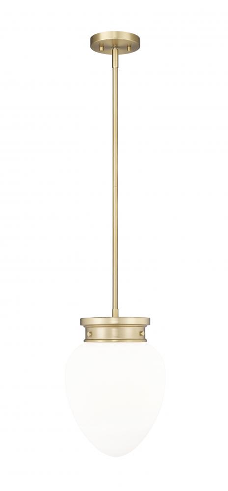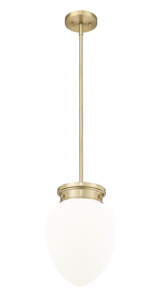 A chic silhouette is crafted with schoolhouse inspirations to bring vintage charm to a modern one-light pendant. Its modern gold finish complements in your kitchen or dining room, with the versatility to blend beautifully in a bedroom or den. Its teardrop-style shade is crafted from matte, etched opal glass to deliver soft, diffused illumination in any setting.