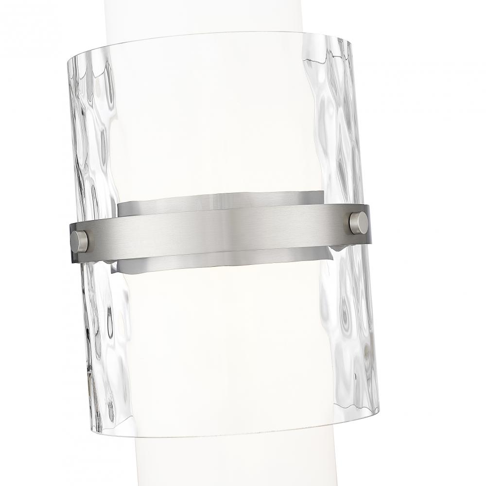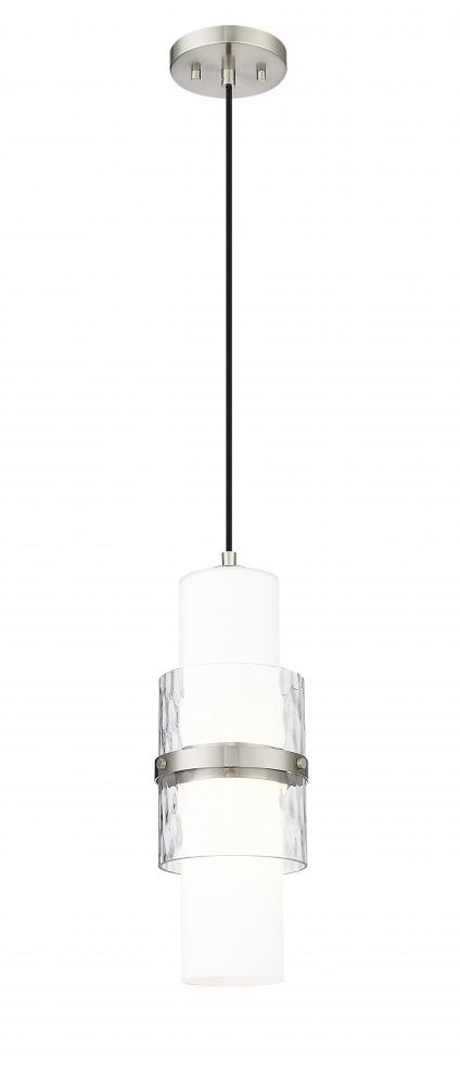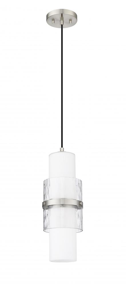 Chic in brushed nickel, this modern one-light pendant is a decorative addition that brings sophisticated energy in any living or dining space. Superbly designed, it centers on a cylinder of etched opal glass that diffuses light beautifully and is augmented with a shorter cylinder of textured clear glass and a decorative cuff in a matching finish. Simply stunning in series over a kitchen island or alone in your den or living room.