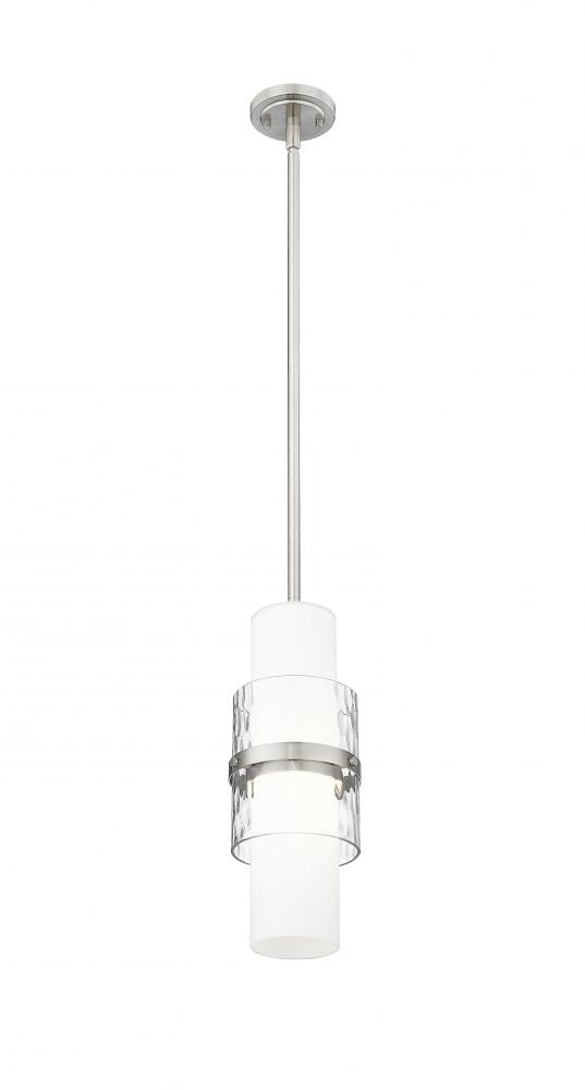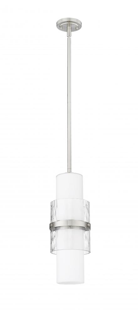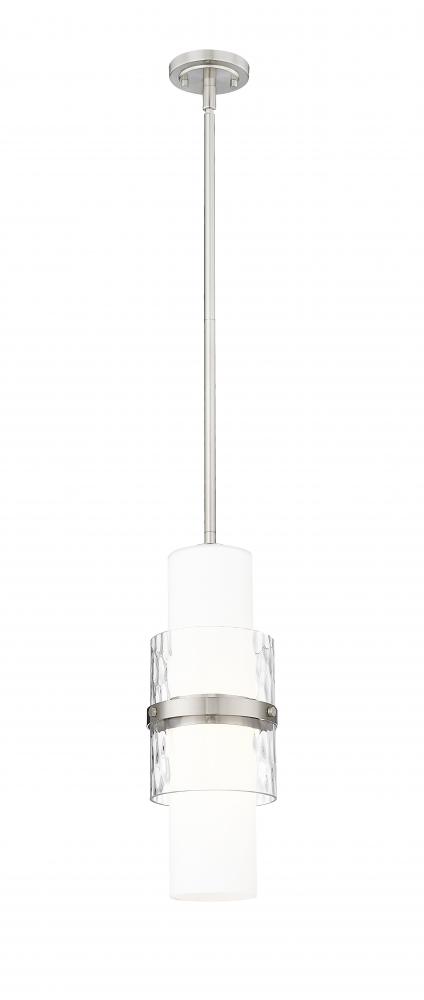 A modern one-light pendant in always stylish brushed nickel introduces sophisticated energy and texture to your home decor. Superbly designed, it centers on a cylinder of etched opal glass that diffuses light beautifully and is augmented with a shorter cylinder of textured clear glass and a decorative cuff in a matching finish. Simply stunning in series over a kitchen island or alone in your den or living room.