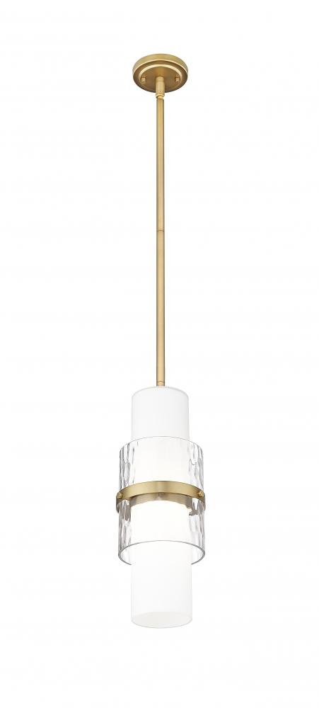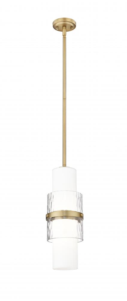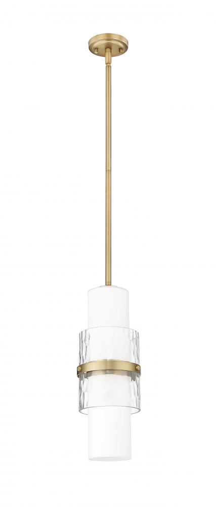 A modern one-light pendant in always stylish modern gold introduces sophisticated energy and texture to your home decor. Superbly designed, it centers on a cylinder of etched opal glass that diffuses light beautifully and is augmented with a shorter cylinder of textured clear glass and a decorative cuff in a matching finish. Simply stunning in series over a kitchen island or alone in your den or living room.
