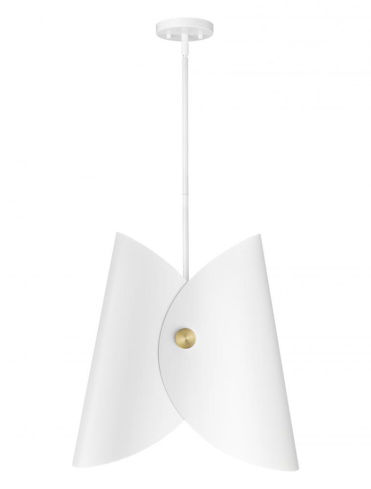 Cool matte white is offset with the warmth of a radiant gold interior accent finish, lending rich sophistication to this modern one-light pendant. It features wrapped metal collar shade with a single button accent, offering a touch of cheeky character and elegance to its tapering silhouette and clean, refined silhouette.