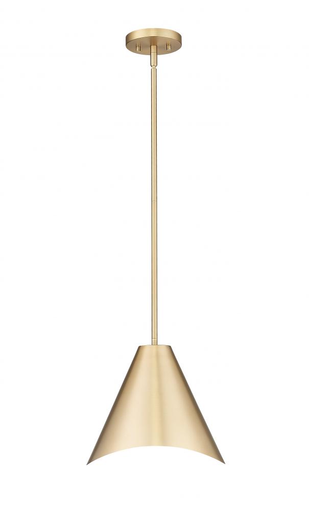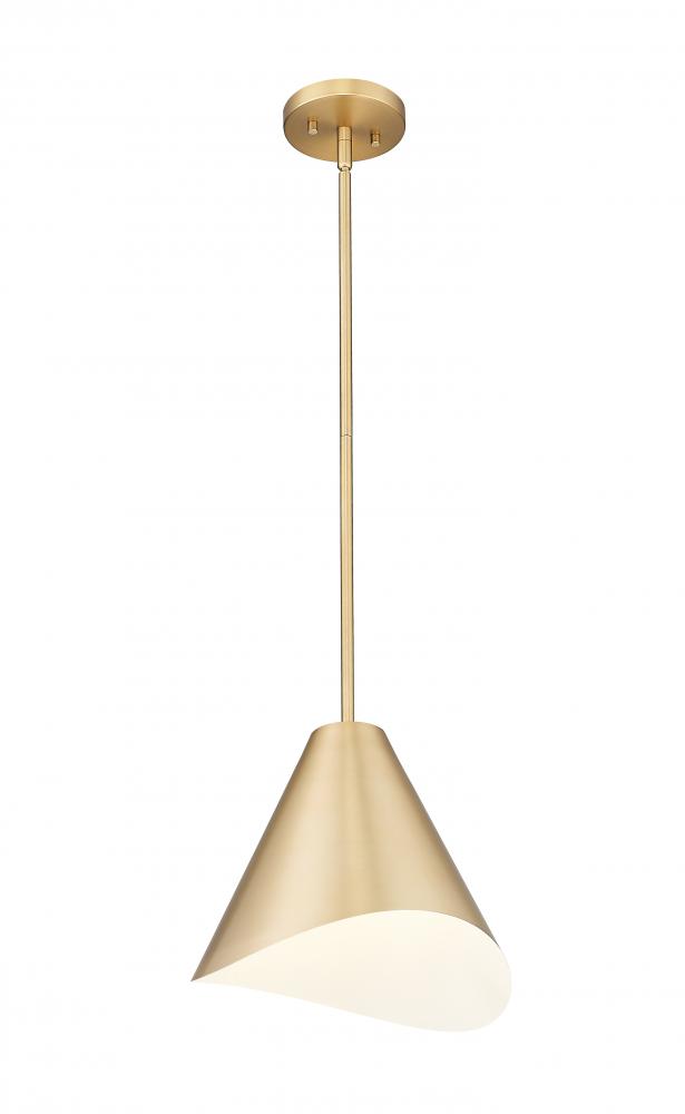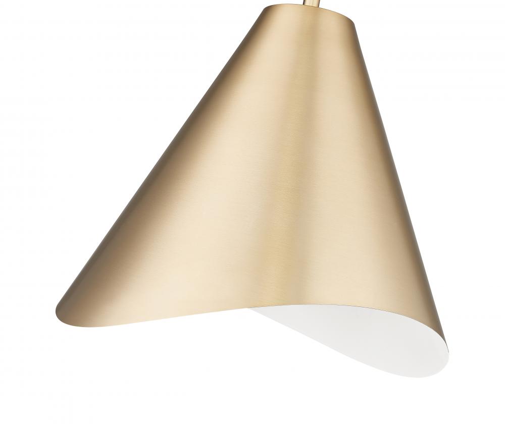 Radiant modern gold lends warmth and sophistication to this modern one-light pendant from the Aria collection. It boasts a conical shade silhouette with a streamlined suspension and a flowing edge detail that adds wonderful artistry. The interior of the shade is finished in white, adding brilliance to its elegantly simple silhouette.