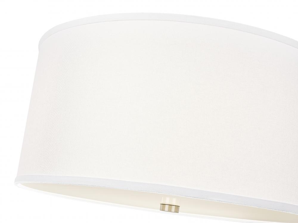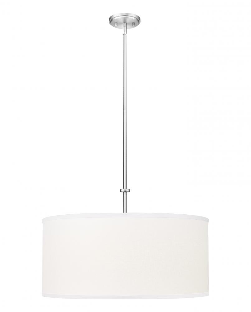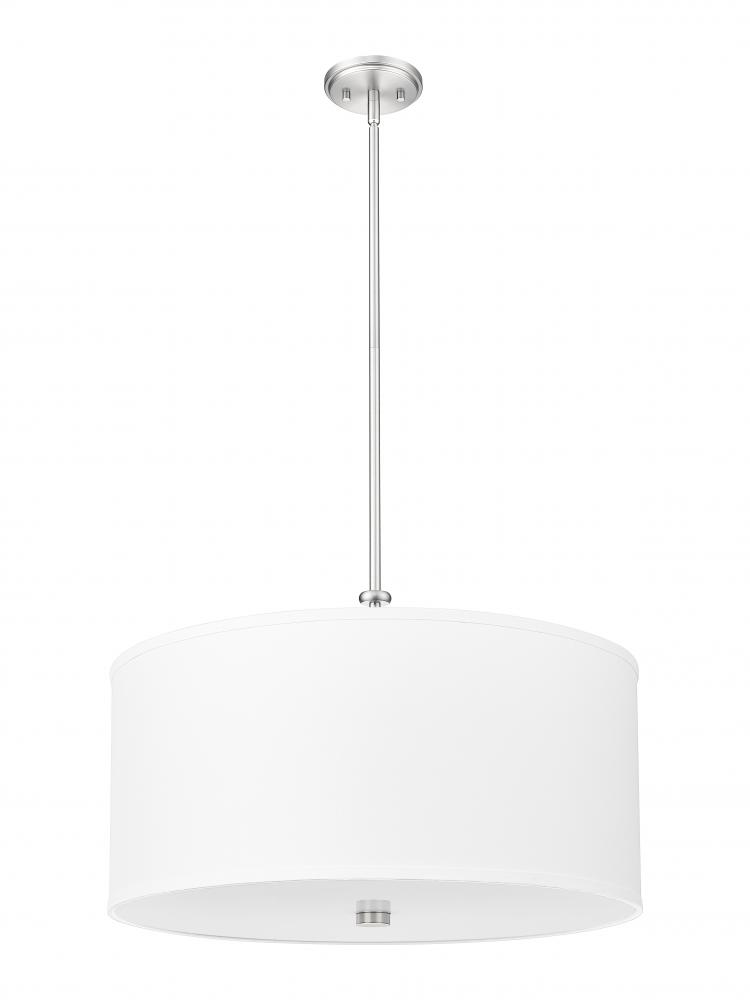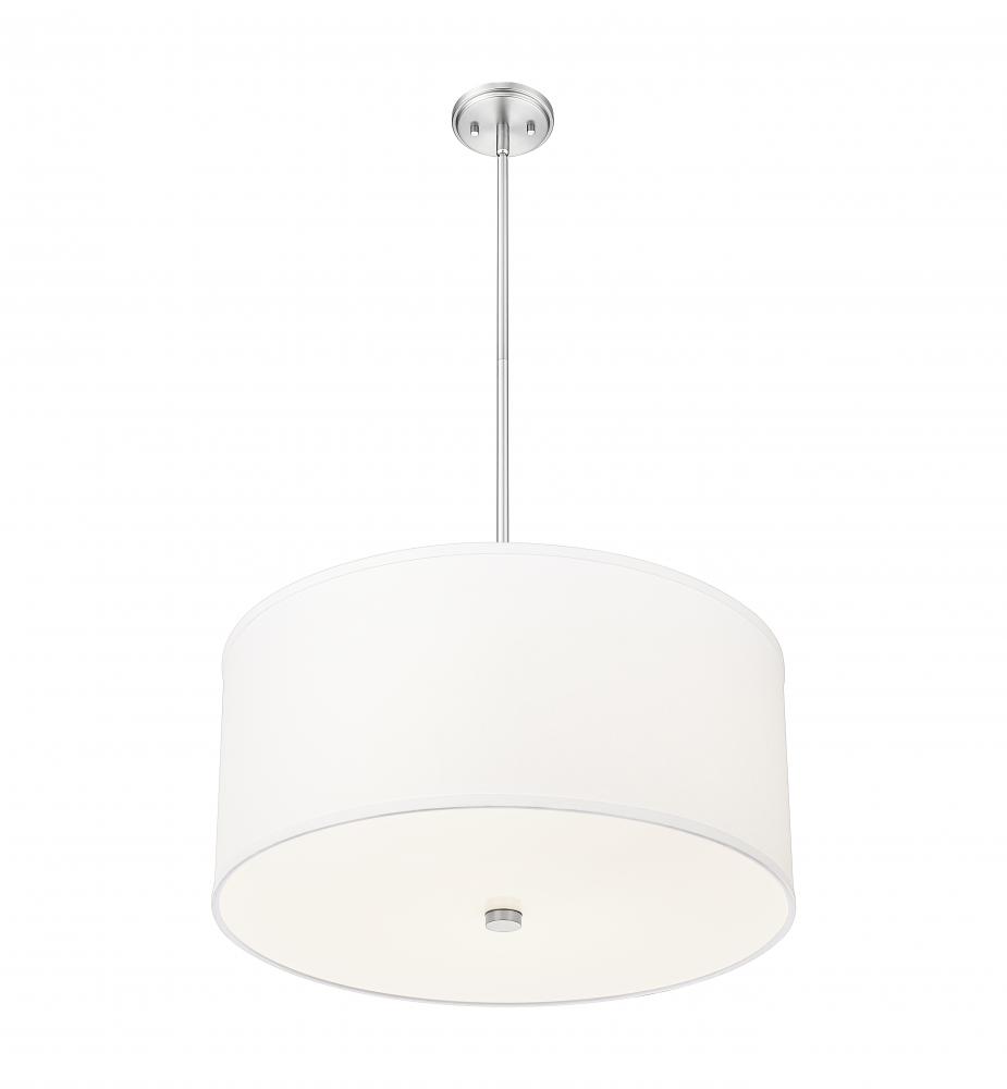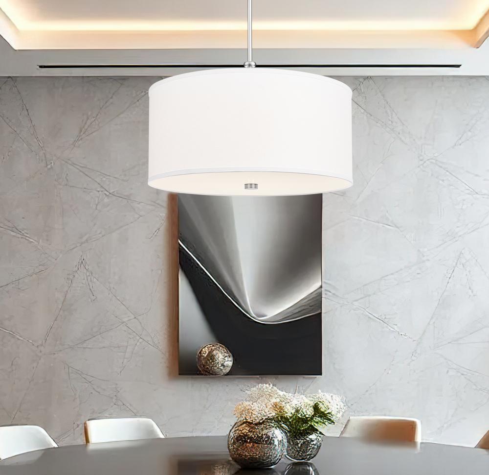 The classic look of an iconic light fixture embellishes this single-light pendant, ideal for any interior setting. Brushed nickel finish steel framing begins a fixture with simple style, as a fabric drum shade and glass bottom diffuser filter soft lighting in foyers, living rooms, and dining spaces. This light is dimmable, offering mood-altering illumination.