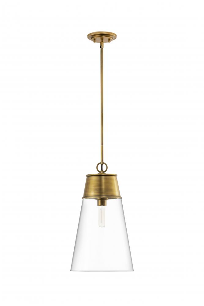 A warm rubbed brass finish embellishes nautical village inspiration, creating a romantic experience perfect for a chic living environment. Indulge in sophistication for a contemporary space, embracing a conical clear glass shade that makes its rich rubbed brass finish metal accents stand out. This pendant offers ambient and spot lighting in a visible modern living area.