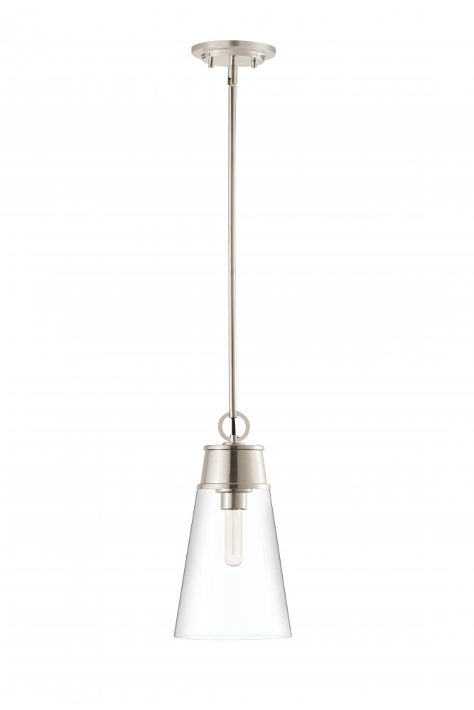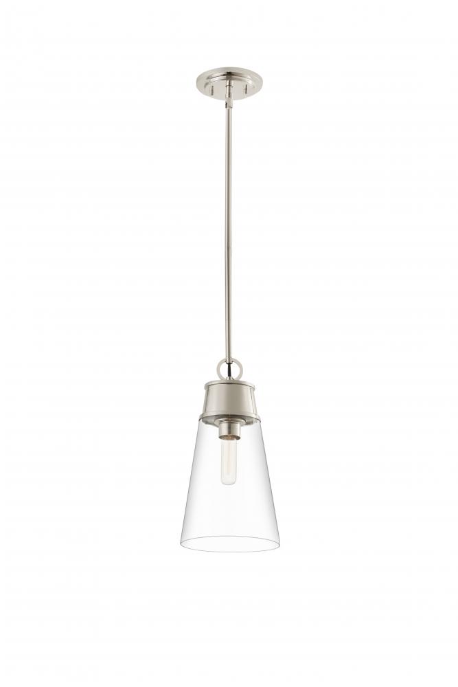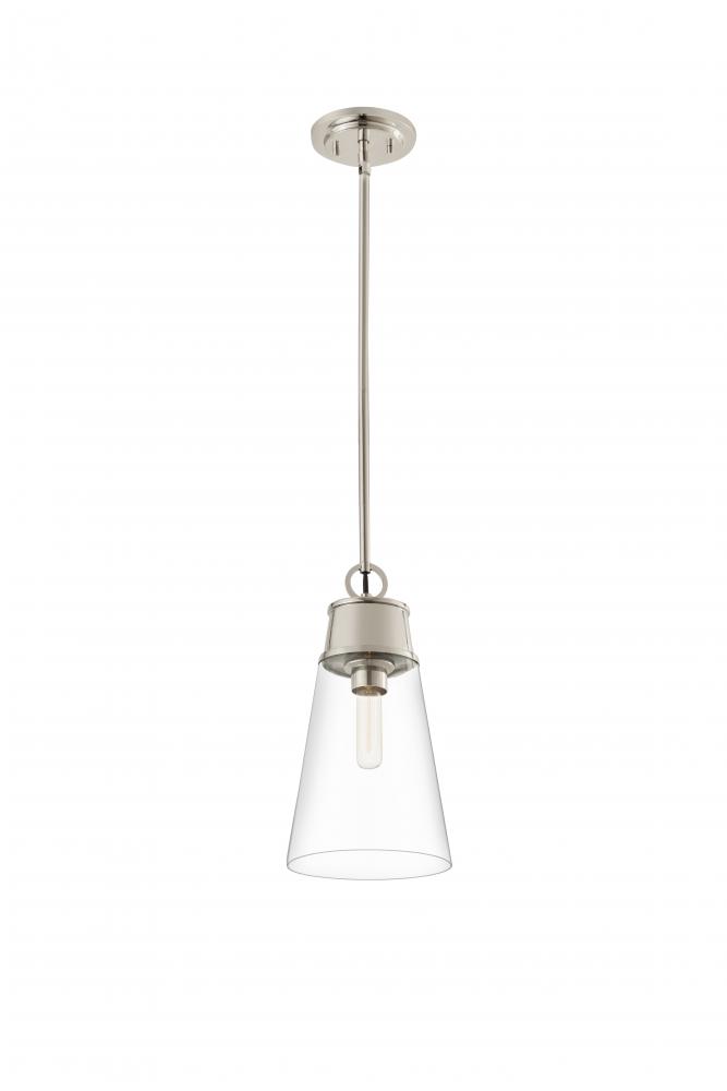 Gleaming polished nickel finish metal begins the style conversation of this chic fixture fashioned to complement any modern setting. Bring targeted lighting to a nook or reading space with this elegant Wentworth mini pendant, crafted of polished nickel finish metal and a conical clear glass shade. An ideal choice for custom spaces, this pendant adds a signature design stamp to define personal taste.