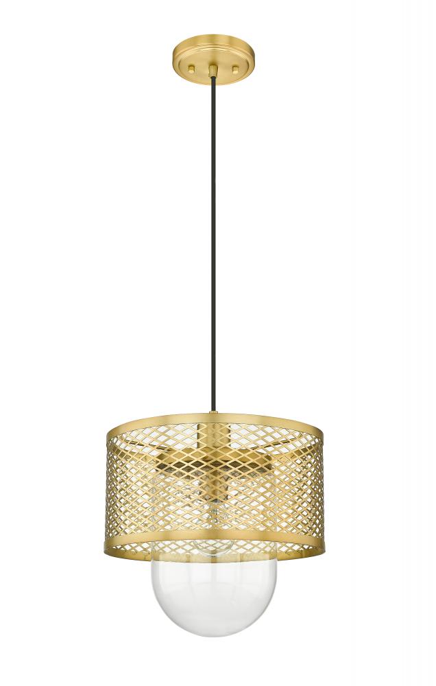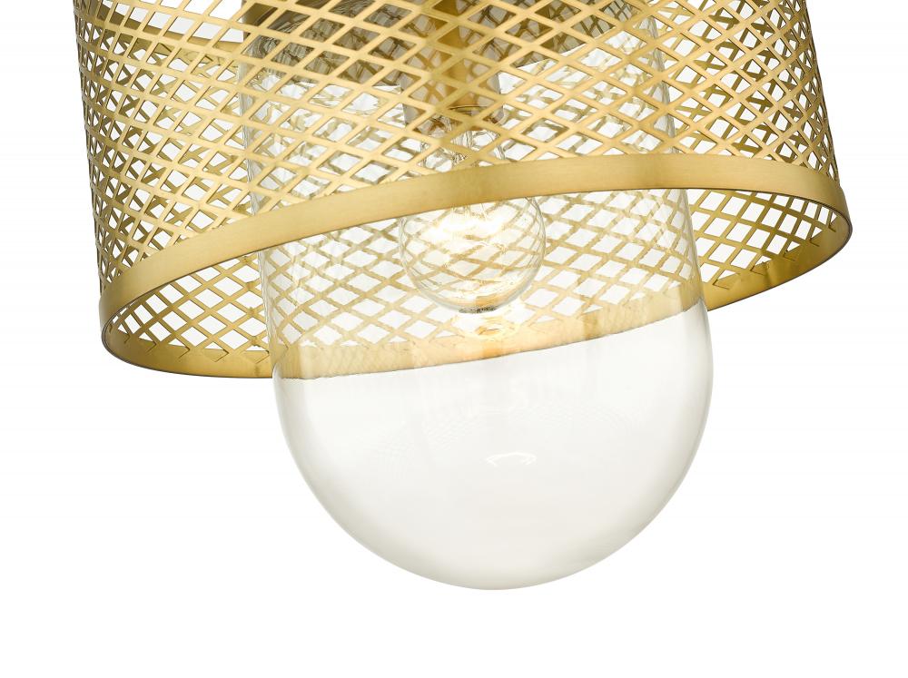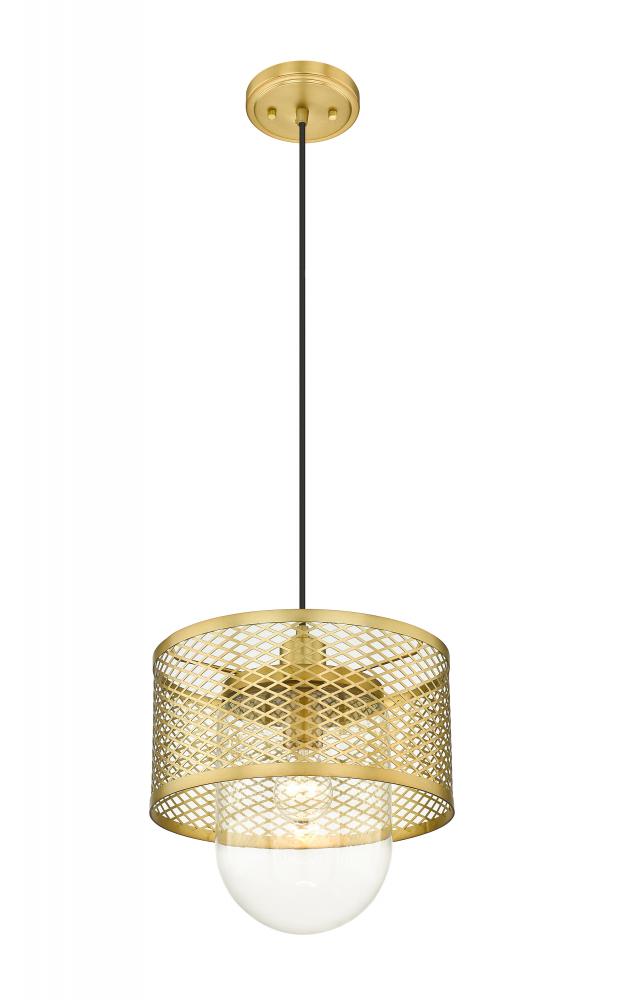 Transform kitchen islands and spacious entryway foyers into a welcoming space with this transitional single light pendant. Drop this one-light pendant into a space, suspending it from the ceiling and allowing light to scintillate walls and floors emitted from a wire mesh cage and rounded clear glass shade that expose glowing filament bulbs. Designed in a classical warm rubbed brass finish, the wire cage presents a chic Art Deco aesthetic that offers a glamorous touch.