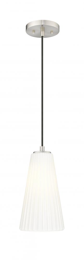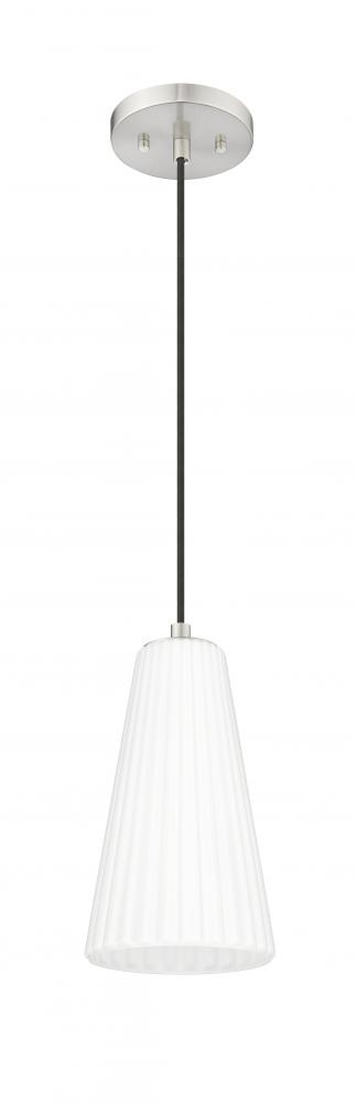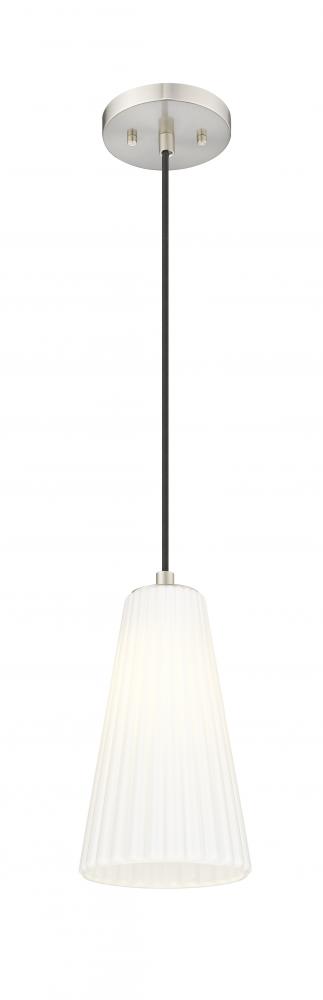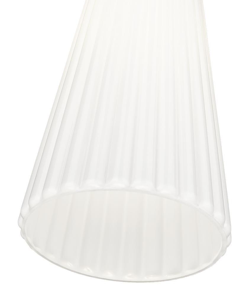 Striking sophistication radiates from a modern one-light pendant. Its elongated silhouette is created with a smooth down rod and a gorgeous brushed nickel finish, all leading to a delicately fluted white glass shade. Its elongated conical silhouette is timeless and refined, offering fresh style to your living space.