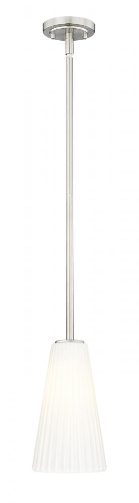Radiant sophistication emanates from a modern one-light pendant. It pairs an elongated silhouette with a smooth, refined brushed nickel finish, capped with a delicately fluted white glass shade. Timeless and refined, this pendant delivers fresh style to your living space or bedroom, instantly elevating the surrounding decor.