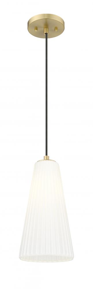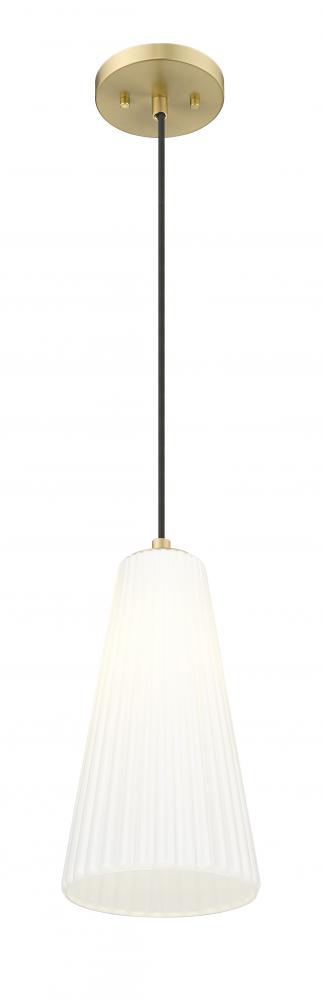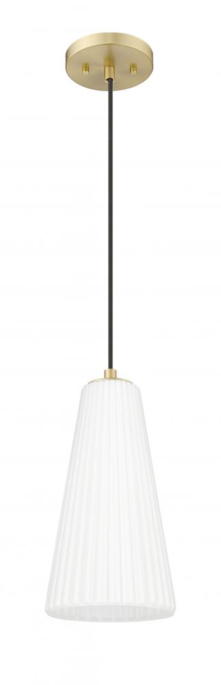 A rich modern gold finish creates a touch of warmth for a modern one-light pendant. Striking over a bedroom or living area, its a bold choice alone or in series to create a larger lighting installation. Its flared shade is crafted in frosted white glass, complete with fine fluting that creates the perfect hint of dimension and delicacy.