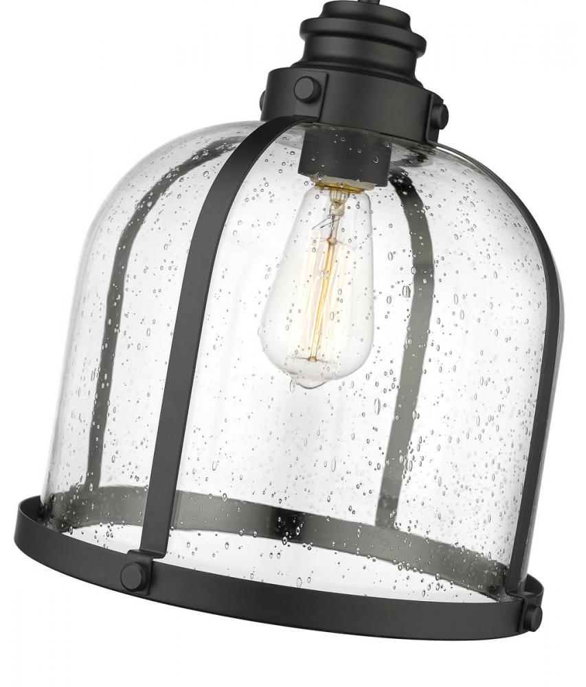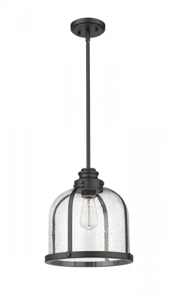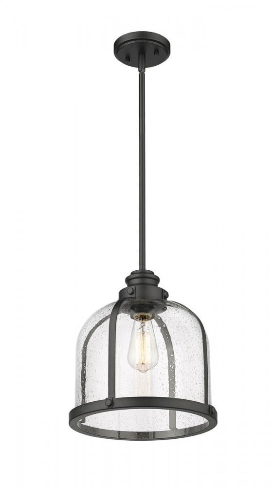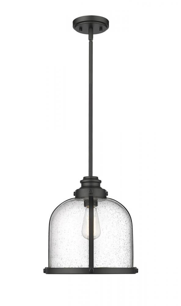 Add character to a dining or living space with this matte black finish one-light pendant. Seedy glass creates an ethereal domed shade that nestles in an industrial-inspired steel frame, offering an eye-catching design element.