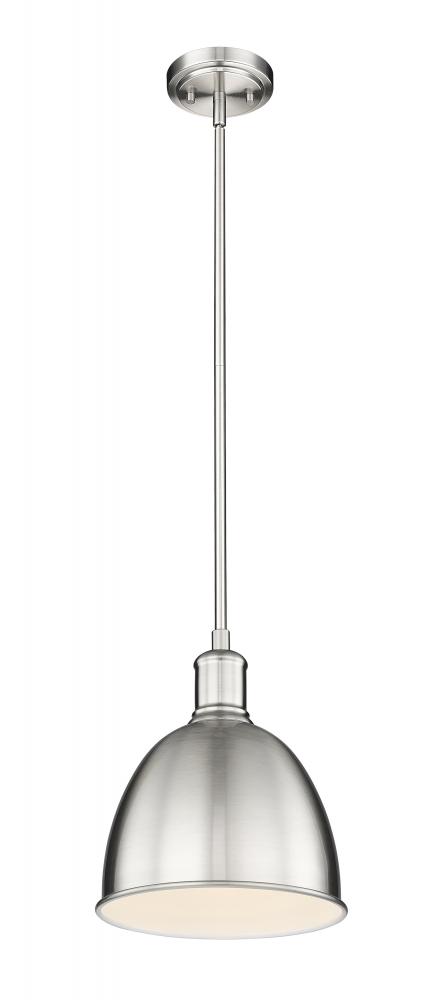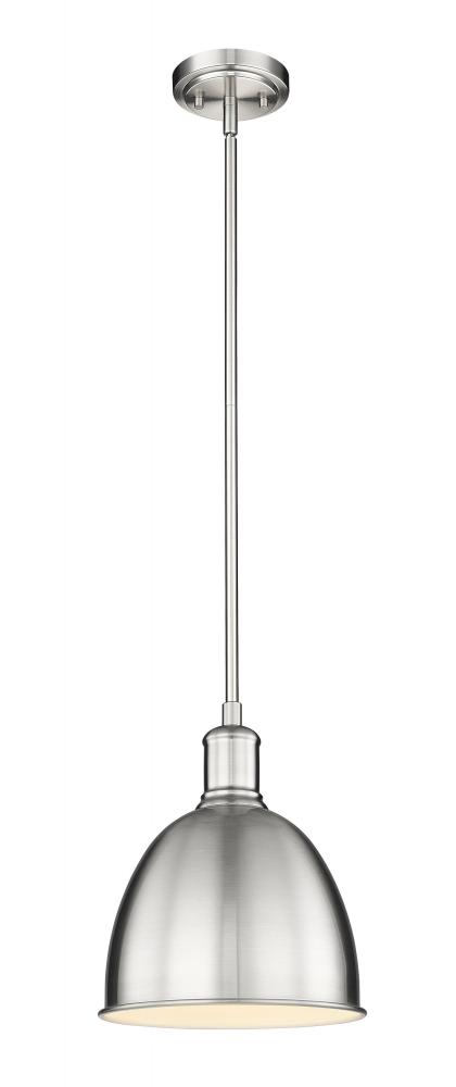 Create ample lighting over a gourmet kitchen countertop or island with a series of these transitional modern farmhouse pendants. Designed with a shiny brushed nickel finish iron shade that resembles a restored schoolhouse or industrial lighting fixture, this petite single light pendant lends a classically appointed urban-inspired flair. Sleek and simple with contoured lines, this charming pendant is perfect for illuminating kitchen islands where you prep, bake and entertain family and guests.