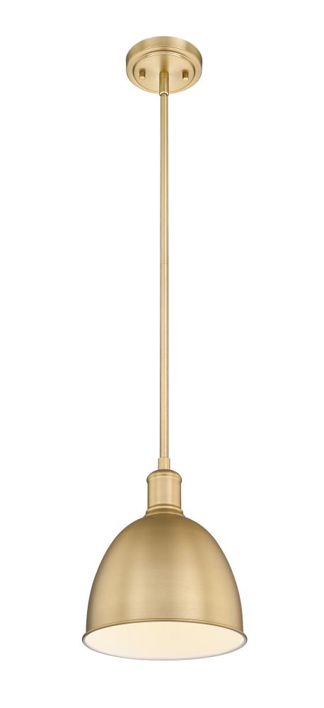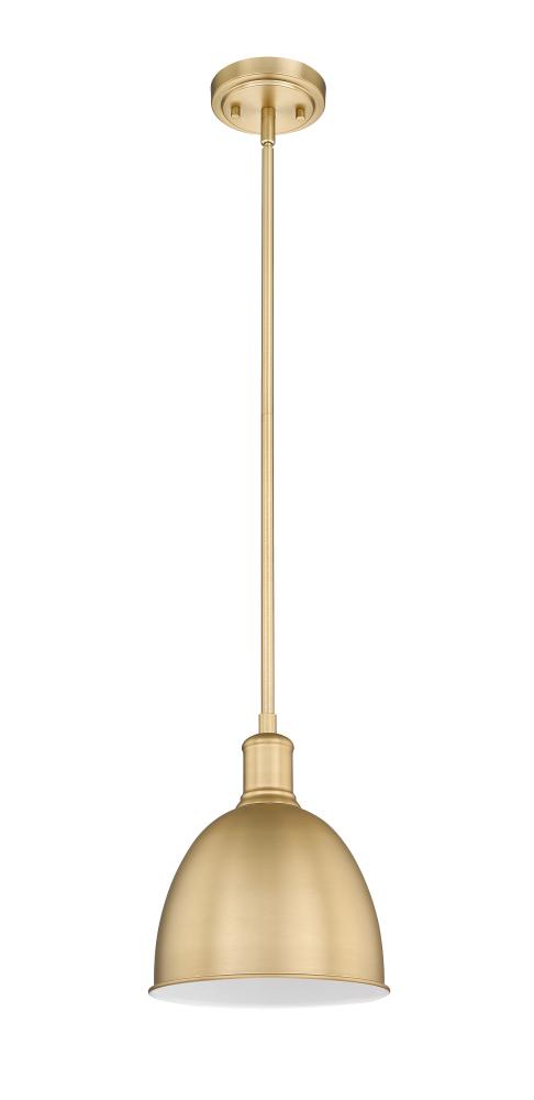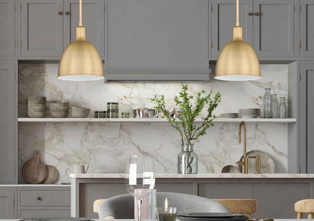 Create ample lighting over a gourmet kitchen countertop or island with a series of these transitional modern farmhouse pendants. Designed with a lustrous and warm classic brass finish iron shade that resembles a restored schoolhouse or industrial lighting fixture, this petite single light pendant lends a classically appointed urban-inspired flair. Sleek and simple with contoured lines, this charming pendant is perfect for illuminating kitchen islands where you prep, bake and entertain family and guests.