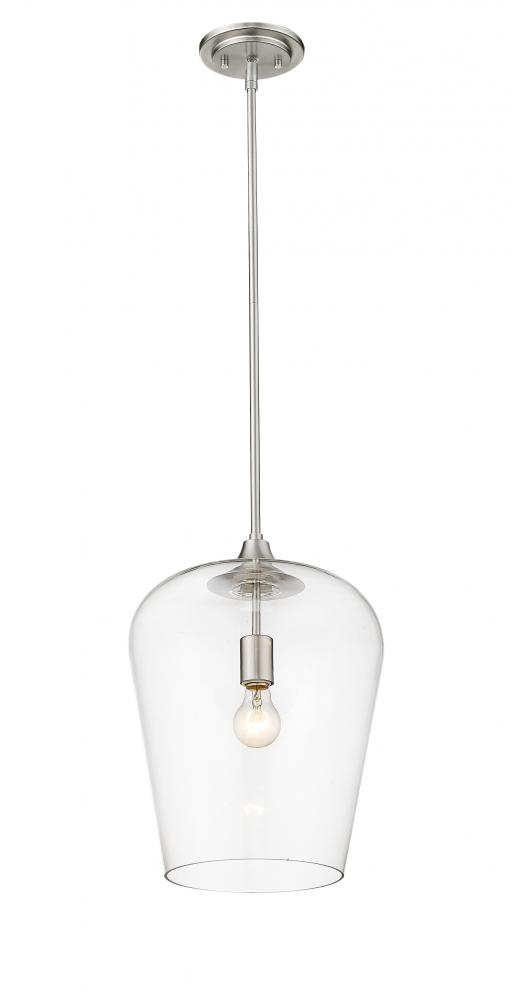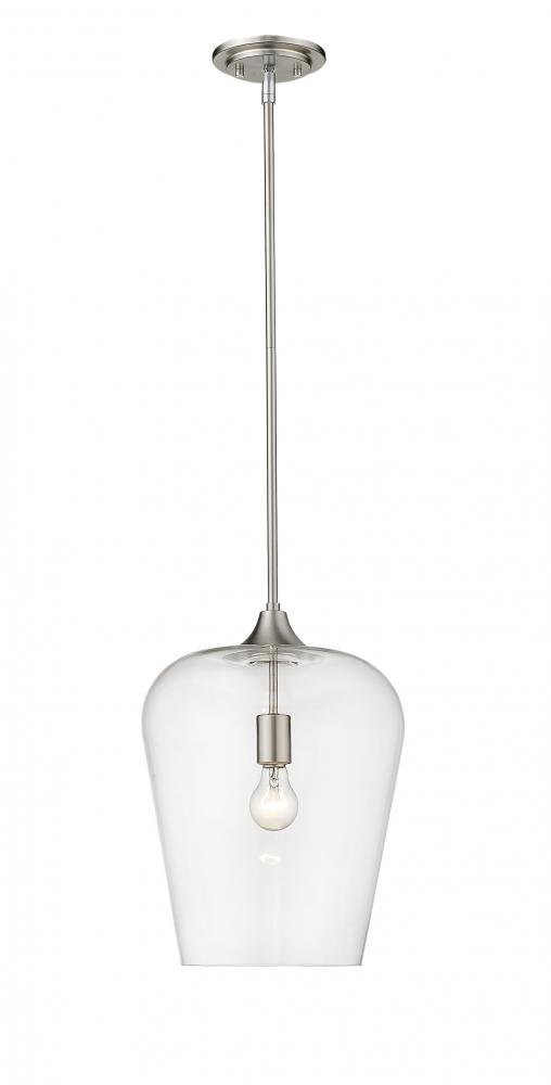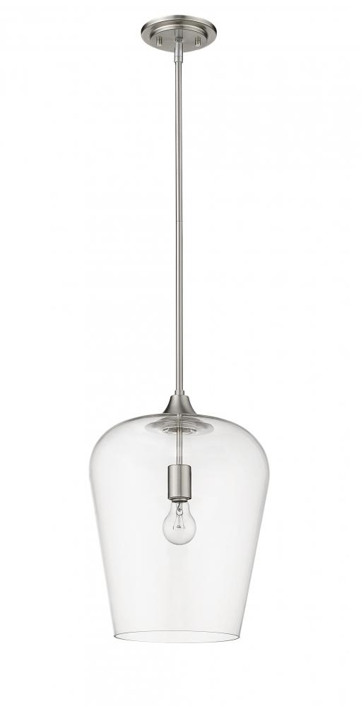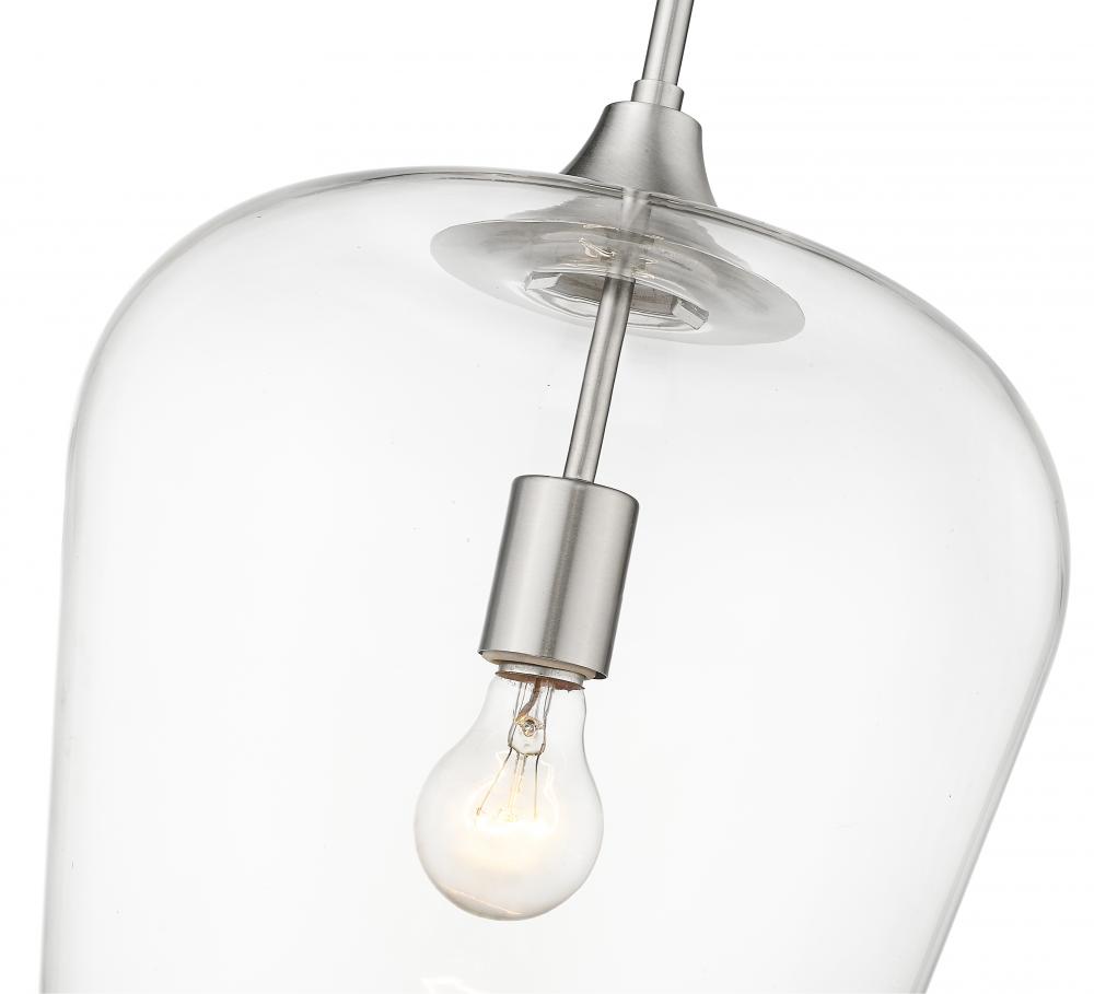 Designed with sleek metal lines and an elegant silhouette, this brushed nickel pendant is a stunning home decor upgrade. This single-light fixture features a clear glass shade for a magnificent display of light.