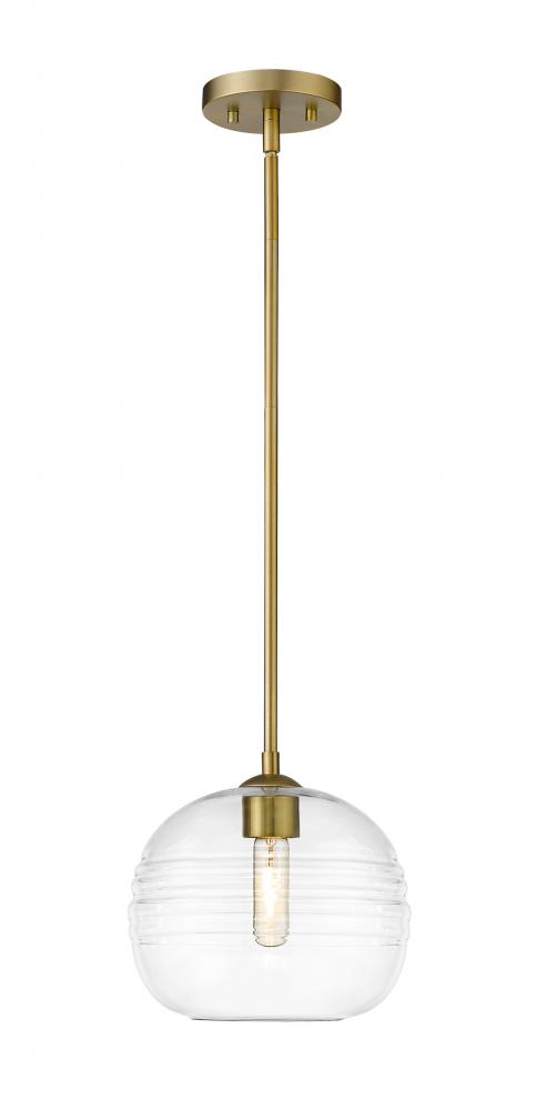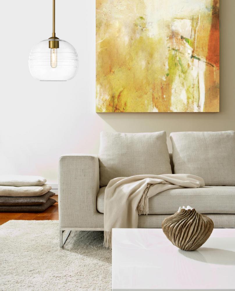 Express your modern aesthetic with this eye-catching one-light pendant. Grooved, rounded shades are made from clear glass, suspended from a sleek steel frame with an olde brass finish. The fixture brings a chic cutting edge to a contemporary kitchen or dining room.