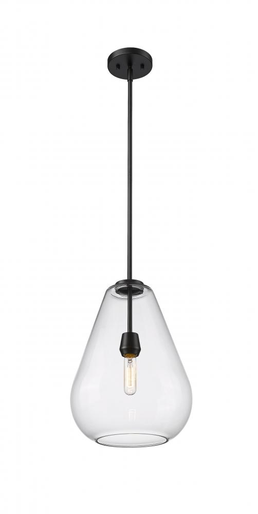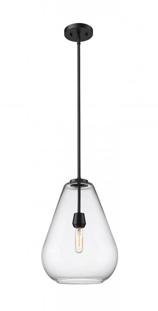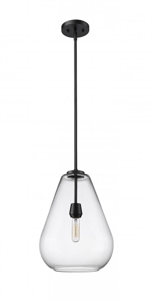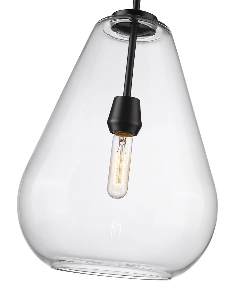 An eye-catching one-light pendant perfectly encapsulates the modern aesthetic. The tapered bell-shaped shade is made from clear glass, suspended from a steel frame with a sleek matte black finish. The fixture brings a chic cutting edge to a contemporary kitchen or dining room.