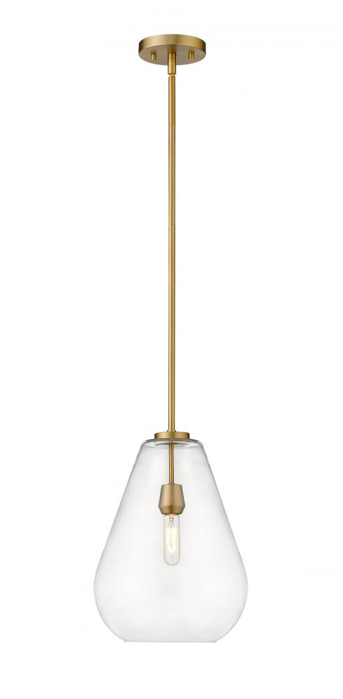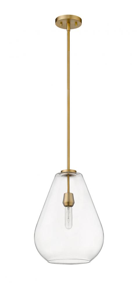 An eye-catching one-light pendant perfectly encapsulates the modern aesthetic. The tapered bell-shaped shade is made from clear glass, suspended from a steel frame with a sleek olde brass finish. The fixture brings a chic cutting edge to a contemporary kitchen or dining room.